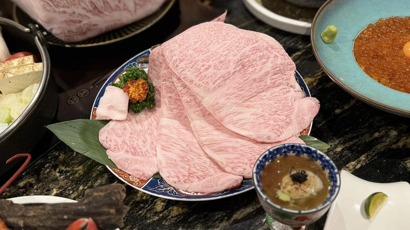 橋山選用頂級松銘柄牛,皆為超過24個月月熟齡的日本A5和牛,來自米澤、宮崎與近江等地。肉質透著柔亮光澤,雪花油脂分布細緻均勻。每一片都是職人刀工與產地風土交織的結果。入口後的油香會在舌尖慢慢化開,厚度不需要誇飾,咬下去就是溫潤的平衡感。蔬菜部分以綜合菜盤呈現,日本大蔥、蒟蒻絲、日本鱈寶與汆燙過的根莖蔬菜讓味覺更乾淨。搭配料理長的醬汁,味道比想像中更耐吃,小編建議如果偏好清淡或是重口味,都可以隨時跟服務人員反應喔。