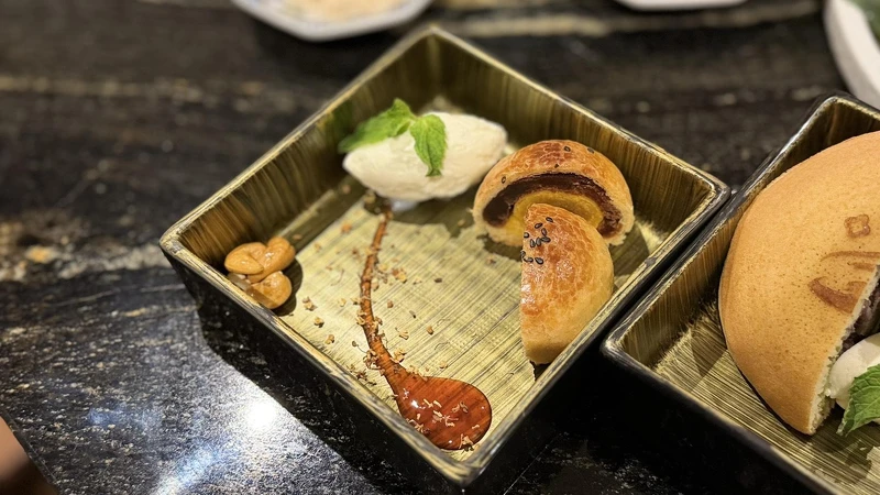 餐後甜點提供銅鑼燒與伯爵紅茶巴斯克蛋糕,巴斯克蛋糕表層撒上炙燒日本上白糖,切開後入口是溫潤濃香,配上馬斯卡彭與鮮奶油,平衡得宜。飲品可選熱鐵觀音或熱抹茶,2種都有安定味覺的效果,尾韻乾淨,讓整頓壽喜燒以舒服的方式收尾。