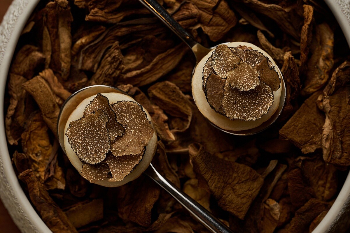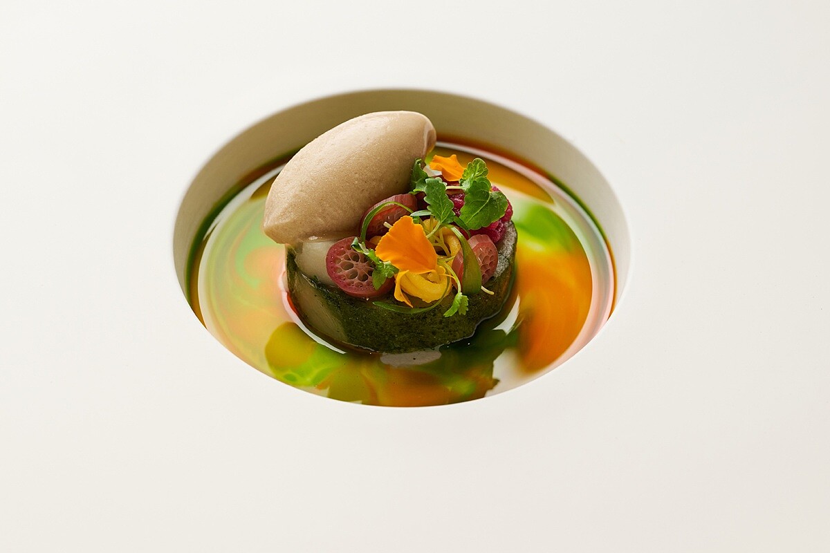 「椰子|松露|卡農扣」靈感擷取自泰國人常做為早餐享用的街頭小吃,外型宛如剖半的章魚燒。有別街邊常使用的蔥花等配料,主廚以香氣馥郁的松露、綜合炒菇搭配帕瑪森起司讓小吃奢華升級,表皮薄脆、內裡鬆軟,鹹甜交織的風味讓人意猶未盡。