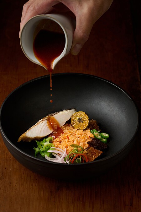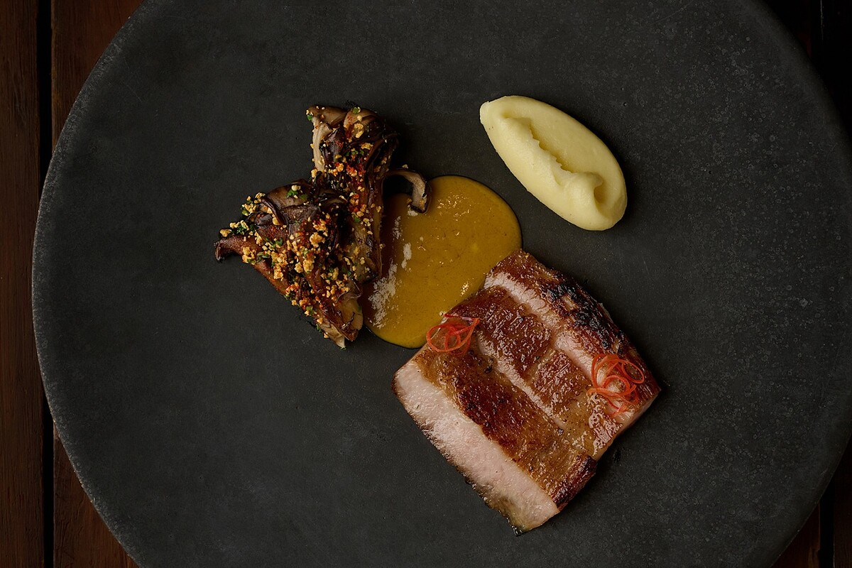 「伊比利豬|舞菇|孟族咖哩」(伊比利豬可加價NT400元升級成「日本A5和牛」)是傳統的泰國孟族咖哩以現搗香料的濃郁香氣為靈魂,透過新鮮薑黃、乾辣椒與各式香草交織出深層辛香,Saneh Jaan 餐廳團隊深入研究古泰食譜與宮廷料理文獻,在此基礎上重構風味。主廚將伊比利豬豬頸肉先鹽漬12小時鎖住肉汁與香氣,並舒肥處理以維持嫩度再烤製。烤好的豬頸肉放入濃郁咖哩中慢火燉煮時,會吸附多重香料與香草風味,展現出圓潤平衡的味道;而青辣椒的溫和辣韻與聖羅勒(holy basil)的清新香氣,可使椰奶香氣鮮明的咖哩更加細緻和諧。