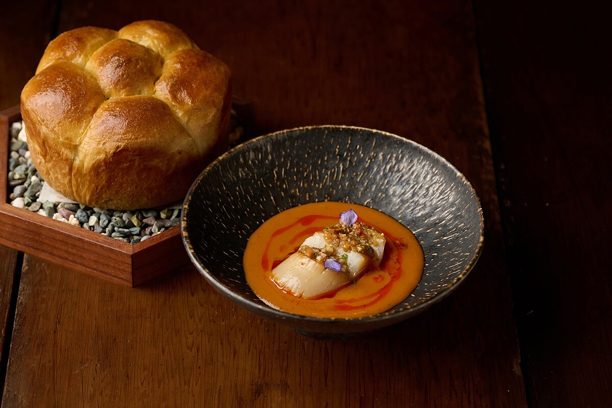 取材自舊暹羅時期多民族共存的飲食文化——當時泰、中、印度香料系統與飲食風味在此交織,並催生出沙嗲醬。Chef Pam使用自家特調、帶有細緻香料層次的沙嗲醬來搭配鮮嫩干貝,藉由干貝的自然甜味與醬汁的辛香濃郁相互提升,使整體風味更為深邃。可以溫熱的牛奶麵包蘸取沙嗲醬享用,辣度會慢慢從喉間散發出來,後勁不容小覷。