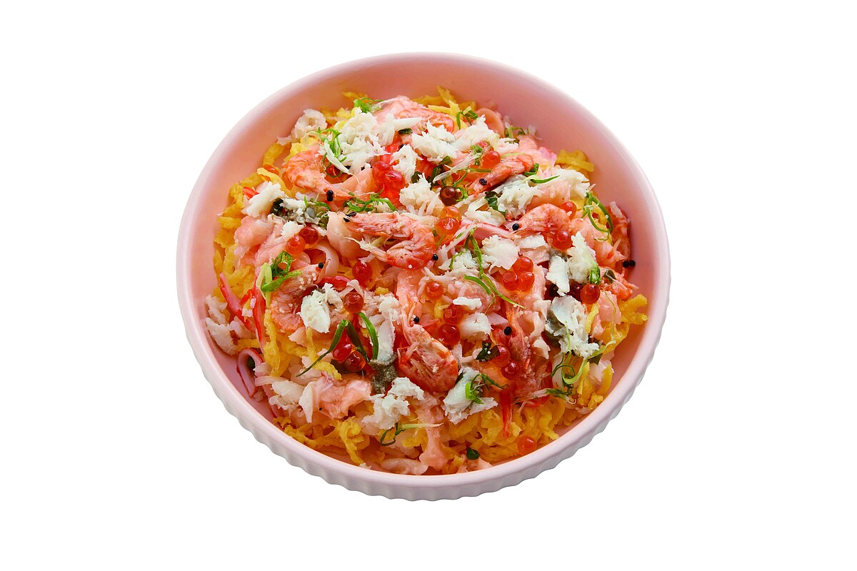 以多樣海味組合打造的豐盛丼飯,包含鮮蝦、海鮮小菜等經典配料,視覺與味覺一次到位。