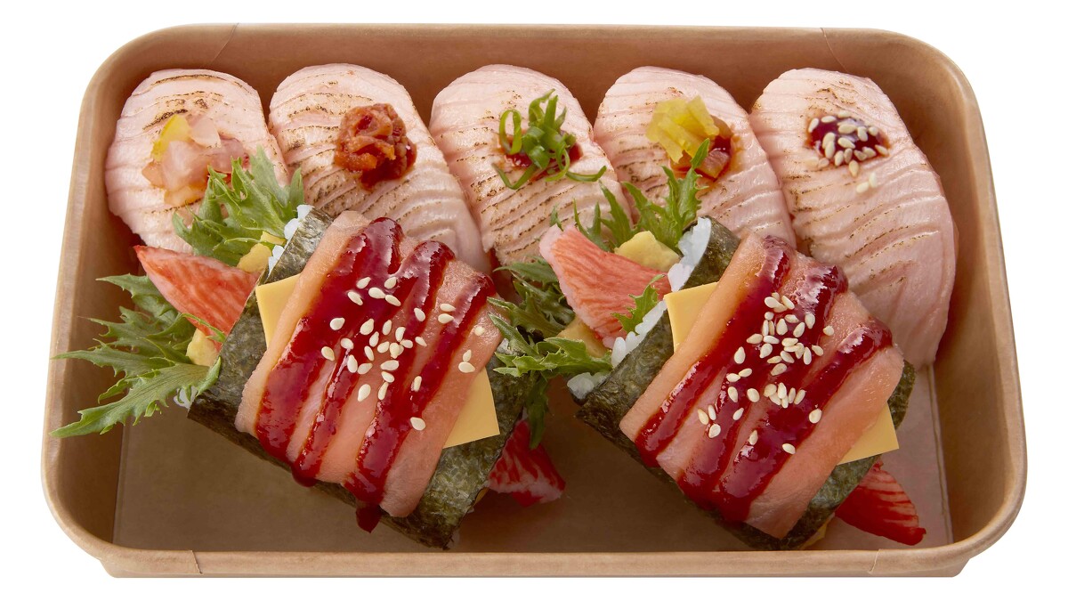 一次集結8個熟食握壽司,包含豆皮、玉子燒等經典風味壽司,是上班族與家庭客最常回購、橫掃全年銷量的穩定冠軍。