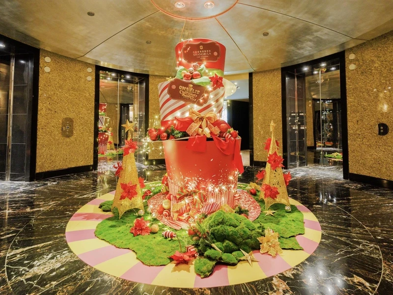 與新北耶誕城的熱鬧嘉年華風格不同,台北遠東香格里拉飯店今年與百老匯音樂劇《巧克力冒險工廠》聯手,將整座飯店幻化為一座超現實的夢幻甜點國度。從一樓童趣薑餅屋到38樓魔術高帽,每一層都充滿奇幻與驚喜。「百老匯魔幻舞台」以糖果山丘、巧克力小徑為背景,設置了巨大的紅白拐杖糖、繽紛棒棒糖與威利·旺卡的標誌性紫紅高帽,極具戲劇張力。而「旺卡溫馨客廳」則透過木質壁爐、柴火光影與堆疊的聖誕禮物,營造出如家一般的溫馨團聚氛圍。為了讓這場奇幻旅程貫穿飯店全館,飯店更推出獨家的《巧克力冒險工廠》聖誕限定住房專案,入住賓客將獲得象徵幸運的「金獎券巧克力」、自行創作的薑餅屋DIY組及手工巧克力杯子蛋糕,讓大小朋友共度專屬聖誕回憶。