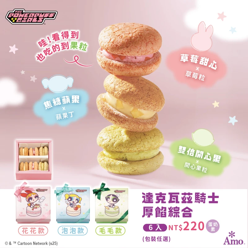 為呼應飛天小女警的「超能力」,阿默人氣商品「達克瓦茲騎士」進行全面升級成「厚餡實力派」,推出花花、泡泡、毛毛三種「達克瓦茲騎士-厚餡綜合」(6入售價220元 ),連包裝都有限定版設計,從視覺到味覺都是大滿足。