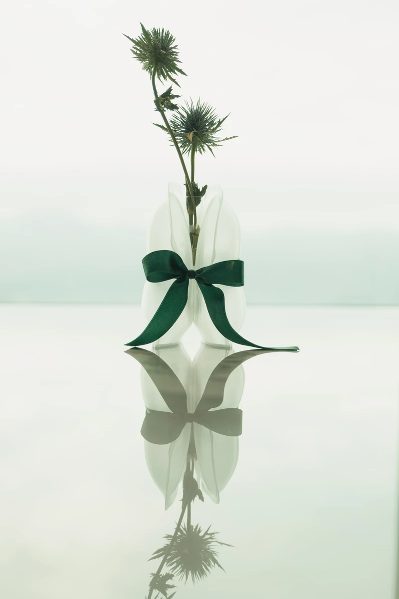 而桌上裝置則延續「花卉」為靈感,運用回收塑膠瓶抽絲再製成透明纖維,透過 3D 列印化為花瓶容器,並搭配 CN Flower 的選花共同呈現。