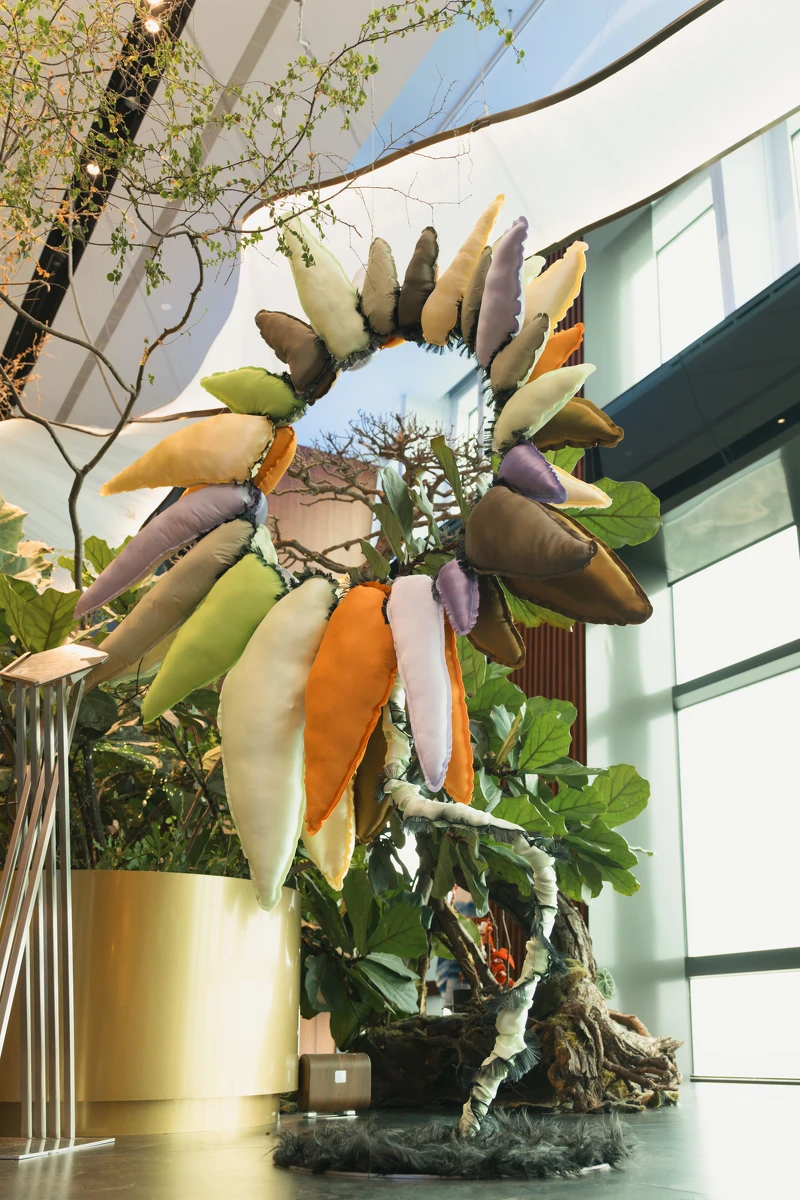 在「饗A Joy」用餐空間裡,陳聖文以布料、金屬、膠膜與緞帶等媒材,打造出結合牡丹、蘭花、向日葵與梅花意象的超現實花園,可以看到放大比例的花朵綻放於大廳入口處,與多物種植栽情境空間互為呼應,以鮮豔色彩與奇幻質地營造夢境般的沉浸體驗,映照出台灣文化的多樣能量。