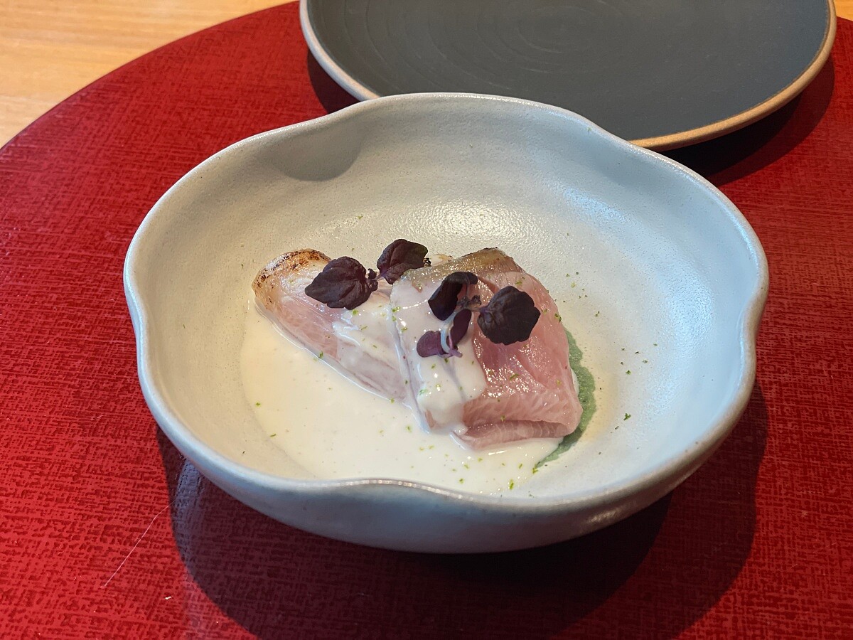 使用自金澤的天然獅魚輕輕「藁燒」(わらやき,是一種日本傳統烹飪技法,使用稻草,日文稱為「藁」來高溫炙燒食材,為其帶來獨特的煙燻香氣和焦香風味,同時能保留食材內部鮮嫩的口感),使其帶著炭香與清爽油脂,再切成薄片,覆蓋在以白子製成的雲子慕斯之上。雲子與白子皆指同一食材,只是經過不同處理而呈現截然不同的質地。搭配香菇的清香,使整體風味柔和而細膩,層次安靜卻清晰,讓食材在同一口中展現海味、炭香與旨味的交織。