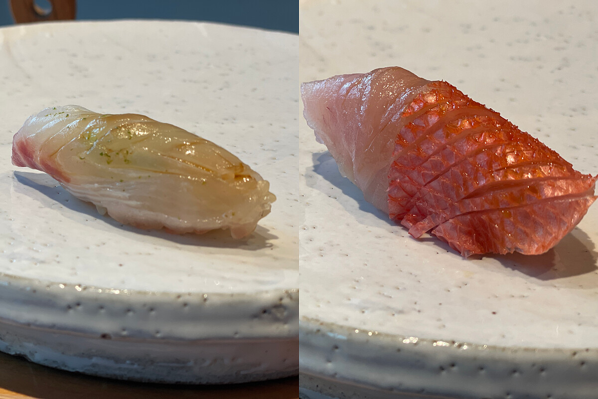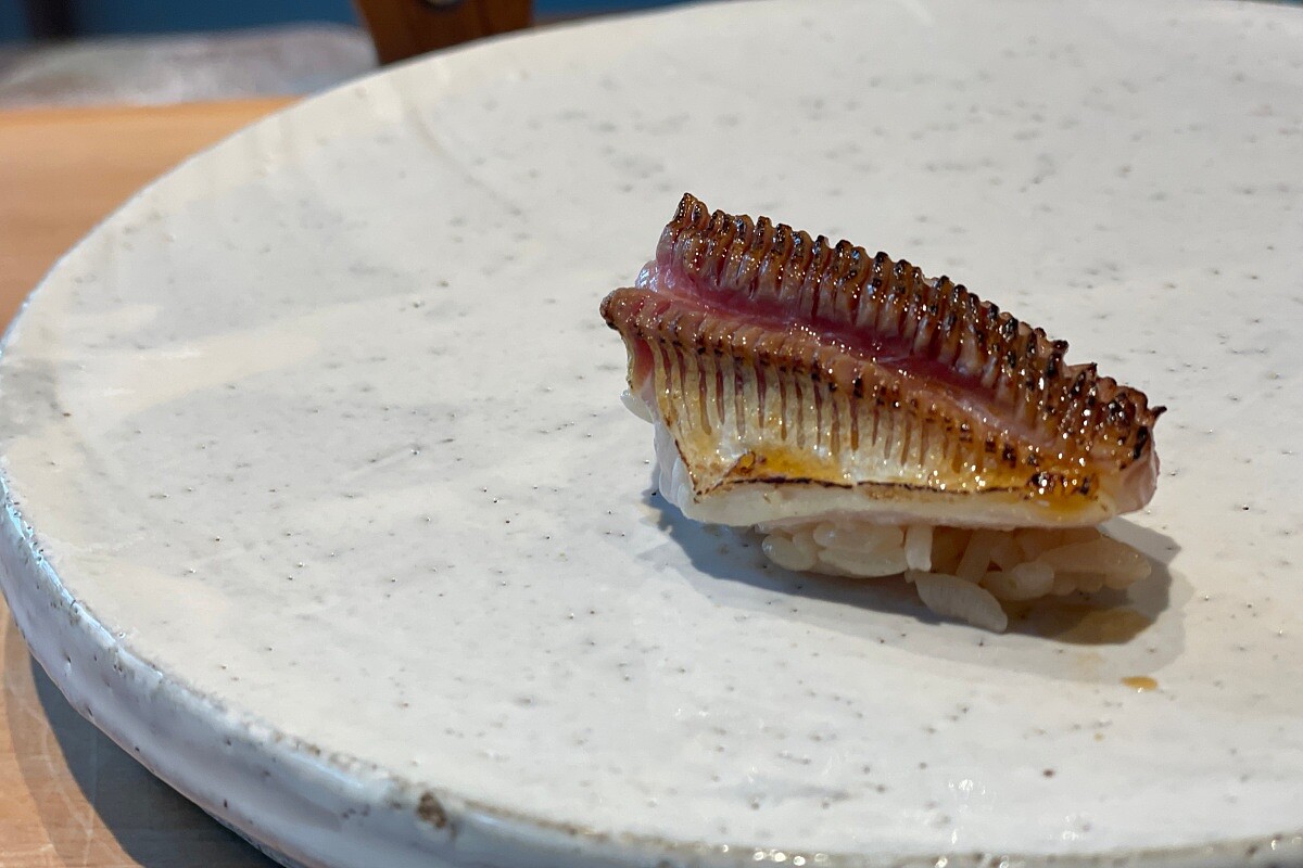 第三貫選用來自北九州的梭子魚,油脂含量充沛。料理時先在魚皮上細緻刻紋,使油脂在加熱時能更均勻釋放,再以炙燒方式留下皮層的彈性與香氣。入口時能先感受到油脂帶出的濃郁芳味,隨著溫度上升,魚肉便展現更柔和的質地。