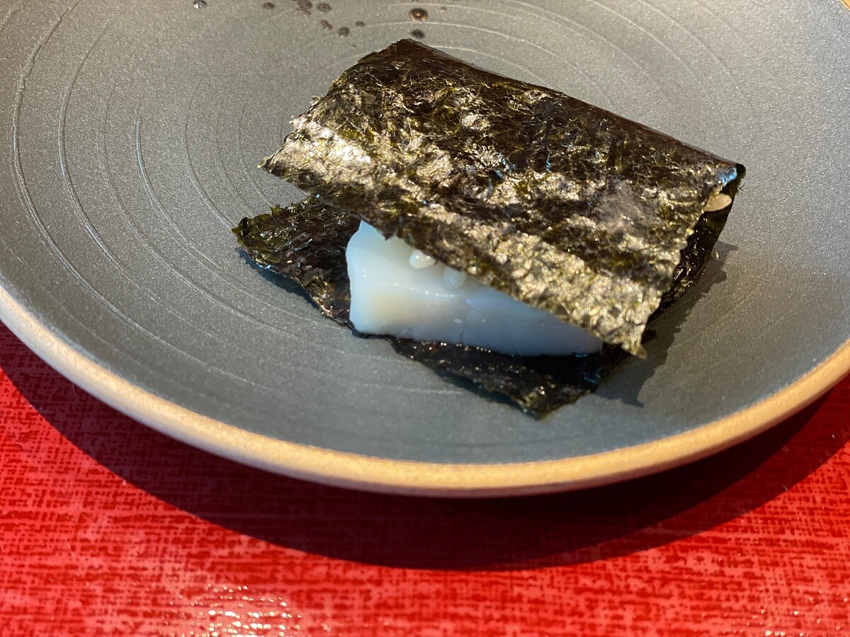在餐期中特別安排三貫握壽司作為過場,讓整體節奏更為舒適。選用金目鯛、真鯛與干貝,皆是依季節與海況挑選。金目鯛以冬季特有的脂香揭開海味層次,真鯛則以乾淨而穩定的旨味銜接中段。干貝以海苔包覆,讓甜味更集中,也使口感更柔和。三貫之間從香氣到味道緩緩鋪陳,讓餐桌節奏自然轉換。
