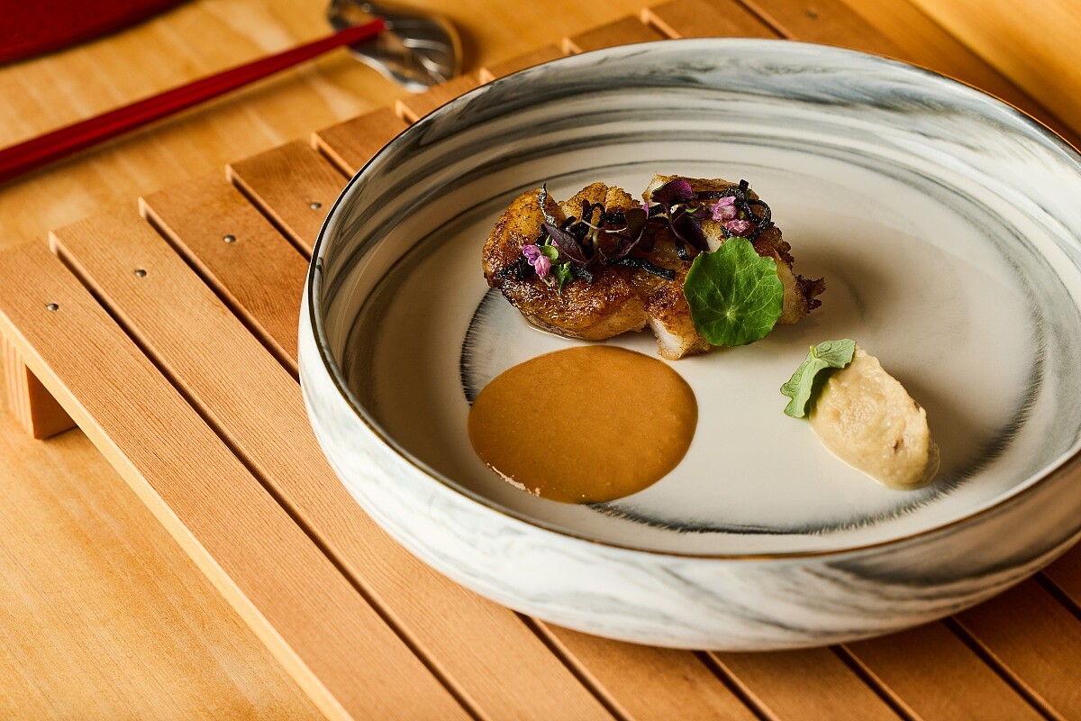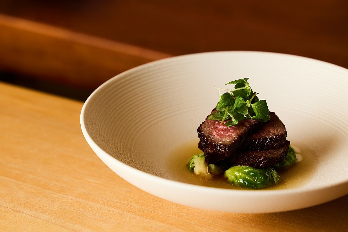 使用來自北海道的鮟鱇魚,肉質細緻且含水量高。為了讓風味更加集中,主廚在魚仍為生鮮狀態時先以昆布汁熟成,讓昆布吸附多餘水分,同時將其自然甘甜緩緩滲入魚肉之中。完成醃漬後再以素燒與奶油燒的方式處理,使鮟鱇魚保持緊實彈性的同時散出優雅而柔和的昆布香氣。