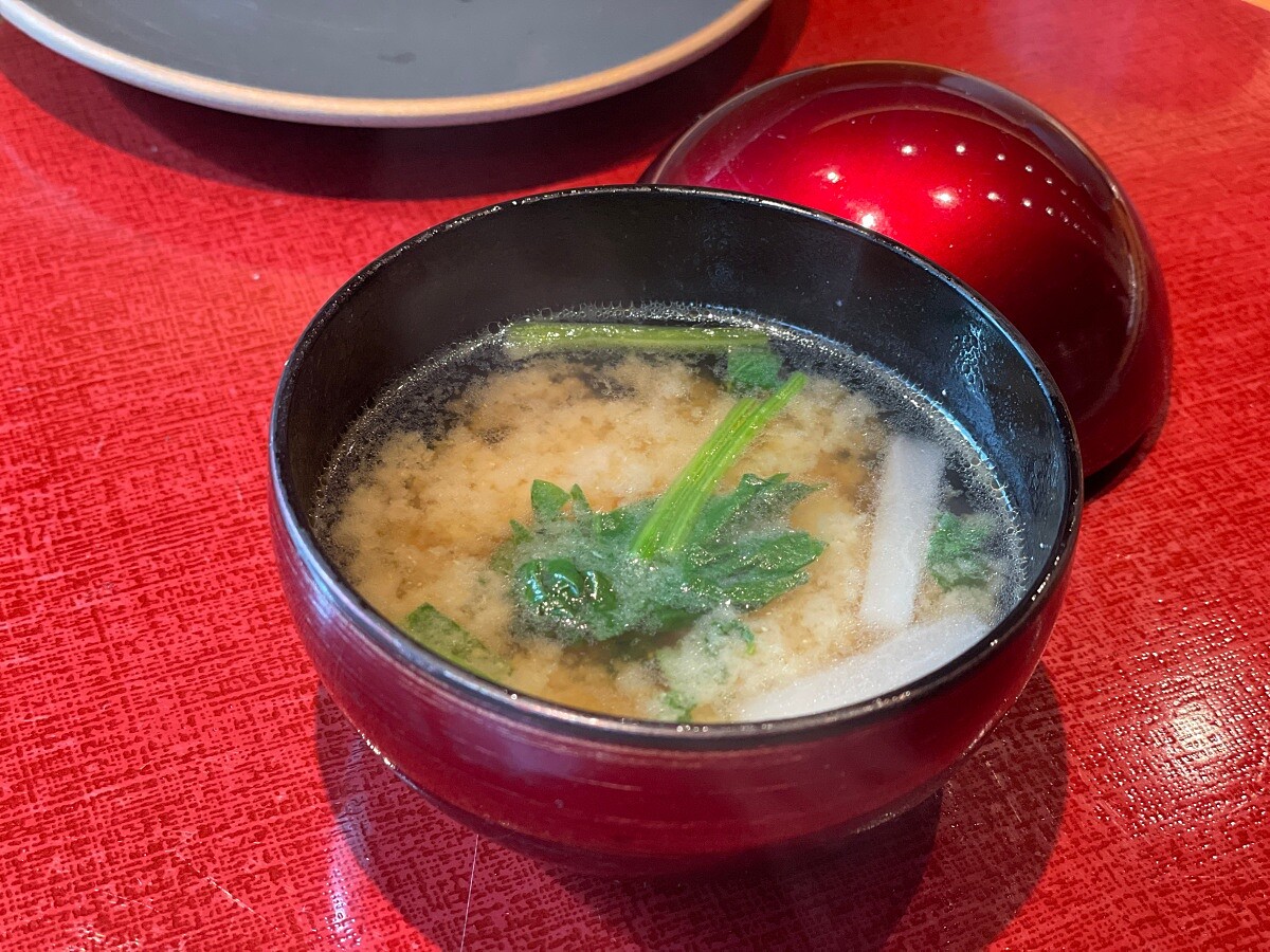 這款味噌湯是冬季常見的收尾料理,用來調整飲食節奏,也讓身體回到最基本的滋補狀態。日文稱作「胃に落ち着く味噌汁」,意指能讓胃安定下來、讓腸胃得到舒緩的一碗味噌湯。湯中加入蘿蔔,利用蘿蔔的酵素幫助胃部修復;豆腐以豆類脂製成,能在胃壁形成保護;菠菜補充身體所需的營養。味噌經手工長時間熟成,使酵素、胺基酸與甜味更加集中,呈現溫潤而安定的尾韻。料理長特別加入少量奶油,讓湯的香氣更為柔和,也帶來不一樣的圓潤口感,使這碗味噌湯多了一份新意。