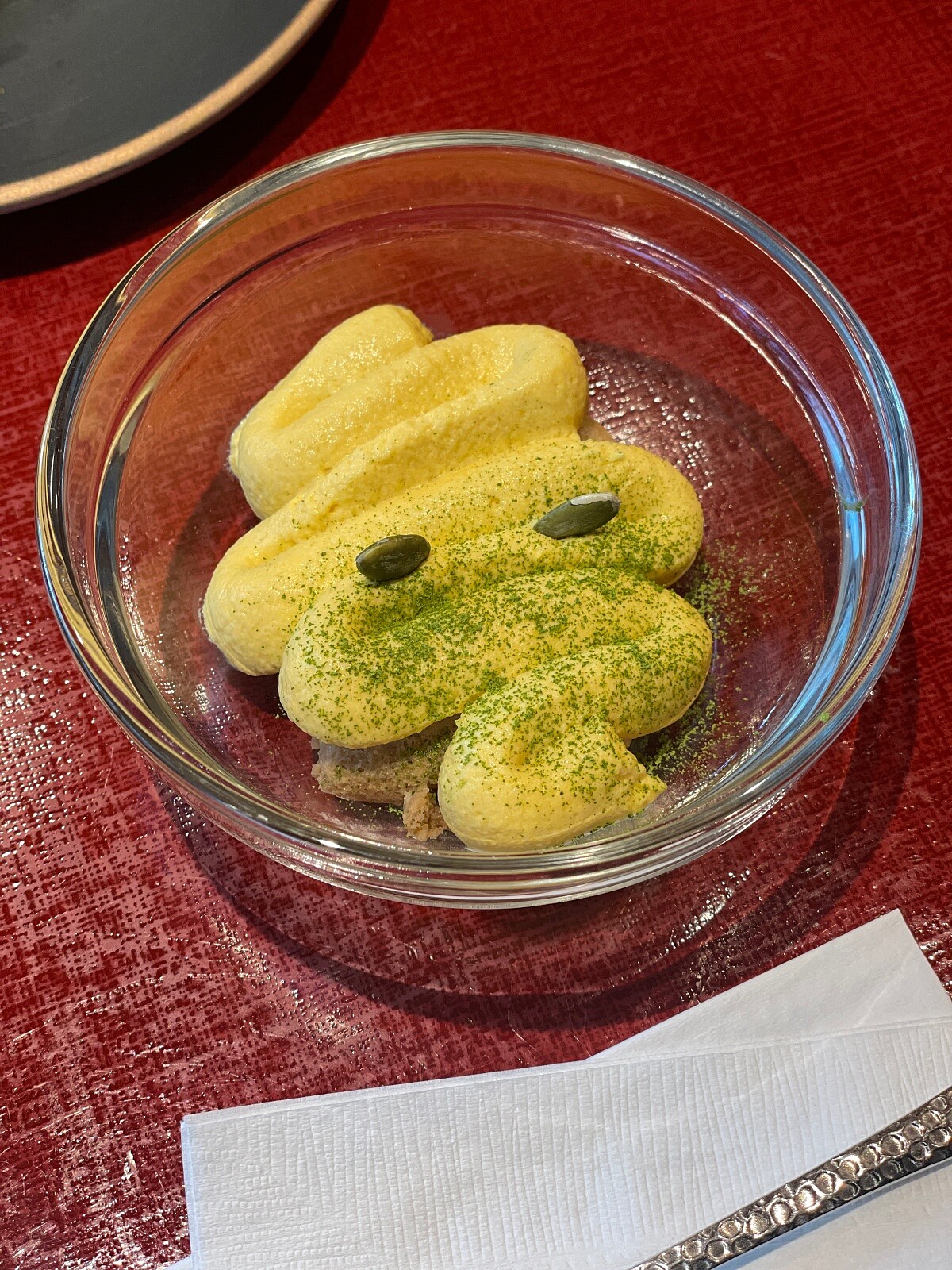 甜點以南瓜製成提拉米蘇,以台灣常見、在日本東北也相當豐富的南瓜作為核心,利用其自然甜味取代傳統甜點中大量精緻糖的比例,延續日式料理追求健康與節制的理念。南瓜的柔和甜度與少量奶油相互融合,使甜味更加滑順。最後撒上京都抹茶粉,帶出清雅的甘苦香氣,也讓整體風味更有層次帶來平衡。