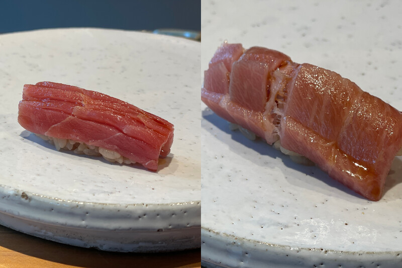 鮪魚部位皆經過約十四天的熟成,使魚肉內的蛋白質分解至理想狀態。整尾鮪魚交貨時約八至十公斤,經過修整、去除乾化外層後,僅留下僅有六至七公斤的中心精華,作為此段最純淨的呈現。中腹與大腹分別以脂香與柔潤堆疊層次,讓熟成後的鮪魚甜度與旨味更加圓潤。