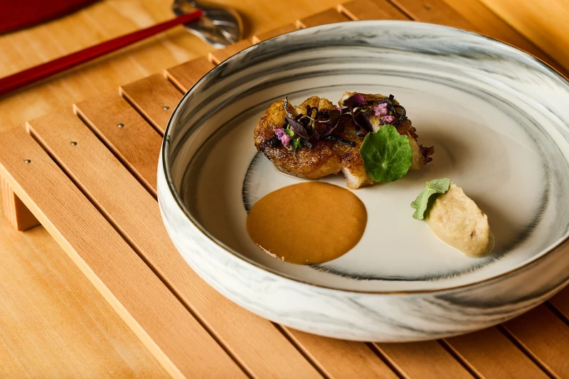 盤中兩款醬汁則讓整體味道更具層次。濃醇的肝醬以鱈魚肝製作,展現深邃的旨味;黃色醬汁由南康魚魚乾熬煮而成,帶來溫潤底韻;另一側的灰白色慕斯則以台灣水茄製作,在炭火煙燻後打成輕盈質地,保留茄子的甜味,不再是一般人記憶中的軟綿或油膩。主廚以日式技法重新詮釋茄子,使其能以更親切的姿態與鮟鱇魚相呼應。濃重食材被重新整理成溫柔而細膩的形態,是整份菜色中安靜卻又強烈的風味。