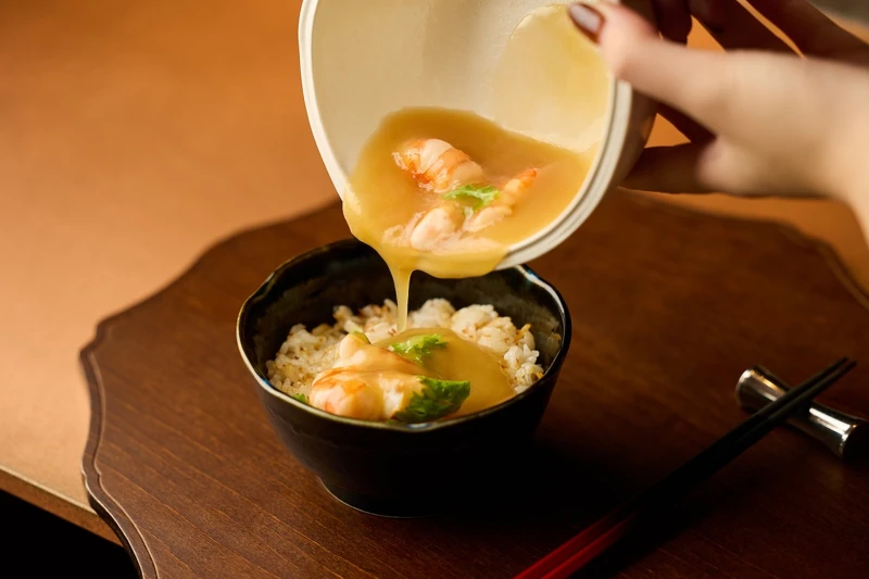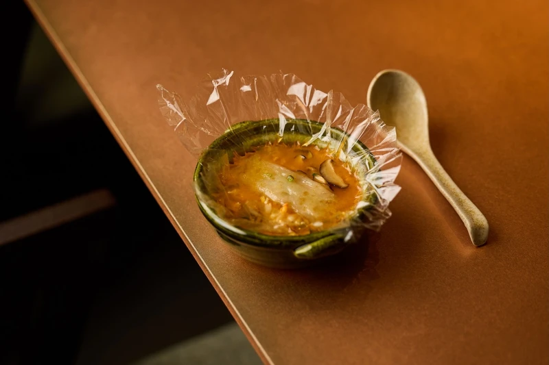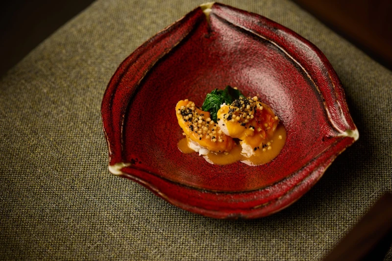 若選擇 3,600 元的十道式套餐,除了同樣提供鴨肝飯之外,前菜會改為「蟹・海膽・春捲」,以鱈場蟹與海膽作為餡料酥炸後鋪上赤海膽,作為更加鮮明的開場。此價位也新增「魚翅天婦羅.撈汁」,魚翅經過泡發與雞湯燉煮後再裹粉油炸,搭配紹興酒上湯呈現,是這套菜單的另一項限定料理。
