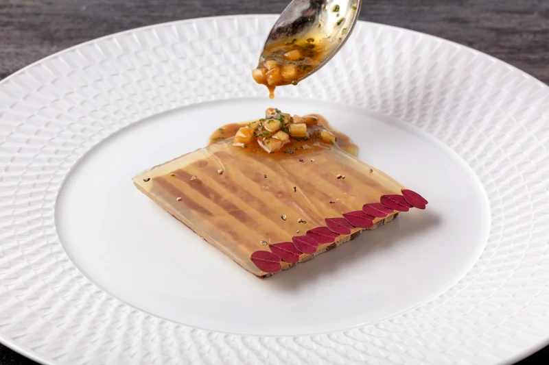 煙燻鰻魚晶凍飾和牛舌鴨肝千層
