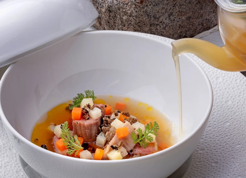 以法式經典 à la ficelle 傳統技法烹調——早期法國家庭會將牛肉以細繩懸掛在熱湯上方,藉由蒸氣緩慢加熱,保留最純粹的風味。主廚選用澳洲和牛腹肉,低溫烹調至 58°C,使肉質細緻軟嫩。上桌後注入以西芹根萃取的澄清湯汁,以蔬菜的清甜取代傳統牛肉清湯,呈現更輕盈優雅的風味。湯面點綴少量取自製作鵝肝凍時保留的油脂,為湯汁增添圓潤度。搭配紅蘿蔔、馬鈴薯、蕪菁與芹菜根四種根莖蔬菜丁,最後撒上新鮮松露細碎,香氣愈加深邃。