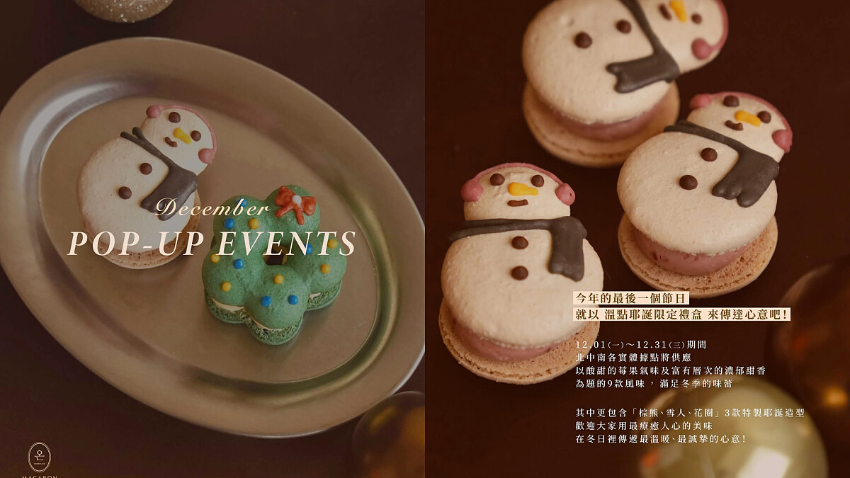 台南甜點店「溫點 Warmplace」以不過甜、風味濃郁的馬卡龍征服甜點控味蕾,長年被網友大讚是「最強馬卡龍」!2025年冬天驚喜推出聖誕限定馬卡龍,可愛造型吸睛度爆表,一上市便引起社群瘋傳。且除了台南本店外,更攜手姊妹品牌「603洞육백삼동|費南雪專賣店」,同步在台北、新竹SOGO百貨展開限時快閃,讓北部粉絲也能一嚐這股來自南部與韓國的甜蜜暖意。