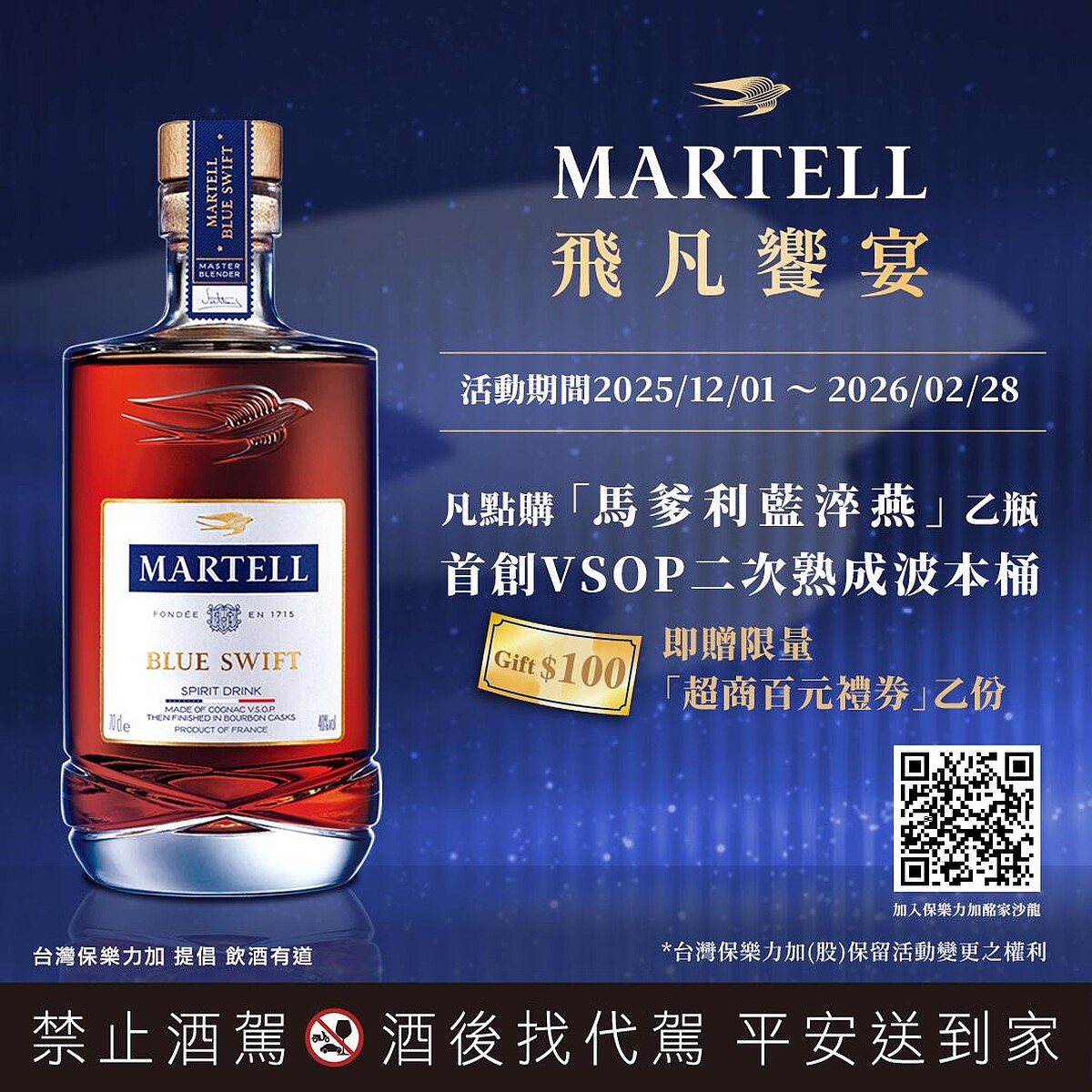 除了攜手全台12間中餐名所推出限定套餐和名饌桌菜,【馬爹利飛凡饗宴】亦將餐食哲學擴展至全台各地,精選北、中、南39家熱門餐廳合作推出限定活動,邀饕客細品「馬爹利藍淬燕」(Martell Blue Swift)——首款將VSOP二次熟成於美國威士忌波本桶,蘊含干邑的馥郁果香及威士忌的烘烤橡木氣息,與各式風味佳餚完美契合。2025/12/1–2026/2/28期間,至合作餐廳點購「馬爹利藍淬燕」乙瓶,並加入「保樂力加酩家沙龍」LINE 官方帳號,即可獲得「7-11百元禮券」乙份(數量有限,送完為止),邀您探索酒香與美食的美味新篇章。請下滑或由點選此連結,探索全台39家熱門餐廳清單>>https://reurl.cc/2lmAGm