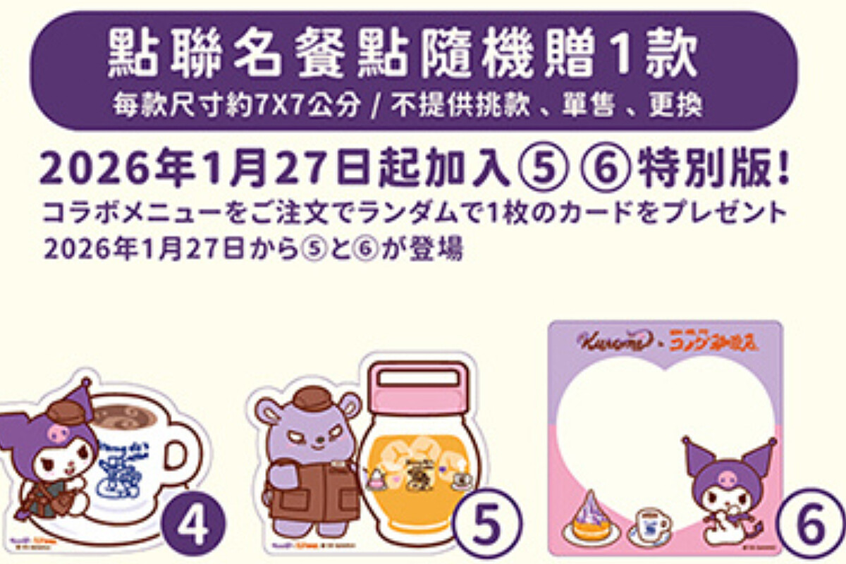 以上凡購買任一聯名餐點,即隨機贈酷洛米插卡(4款)+透卡盲袋(6款,其中2款自2026/1/27起追加),數量有限送完為止。