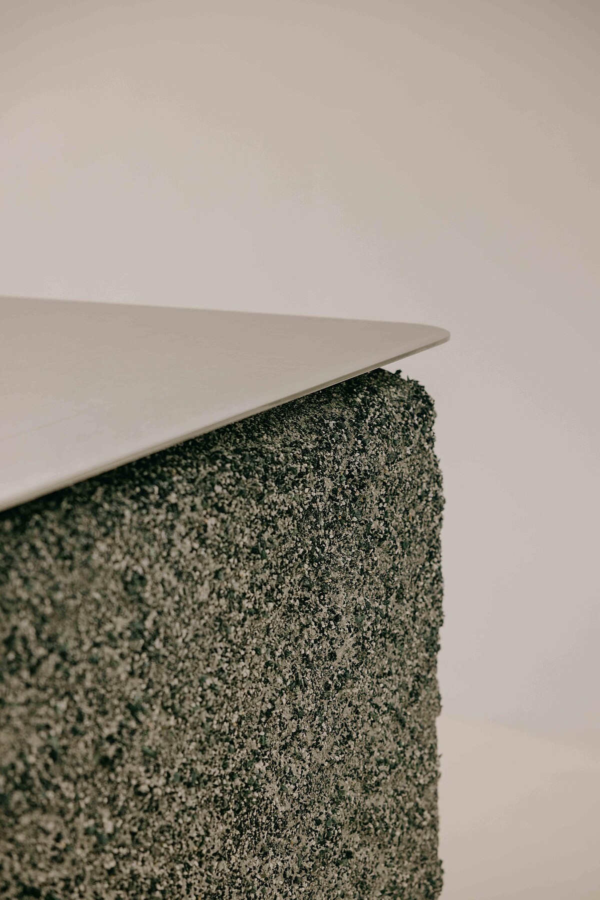 大片落地玻璃窗將街旁綠意引入室內,室內以大面積光膜營造出摩登而內斂的光感,中島特別採用傳統泥作洗石工法,需以水霧反覆沖刷石面形塑自然凹凸質地,每處角落都能見到對於細節的雕琢。在剛硬的鐵件、導角與結構線條之間錯落藝術裝置,整體空間帶有一股充滿未來感的張力,同時也洋溢著低調而優雅的氣息。