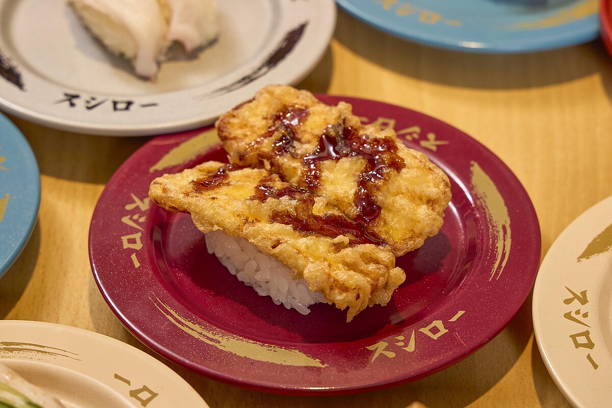 壽司郎獨家配方厚燒玉子,現點現炸成天婦羅,酥內嫩,配上特製甜醬,更凸顯玉子燒的甜香。