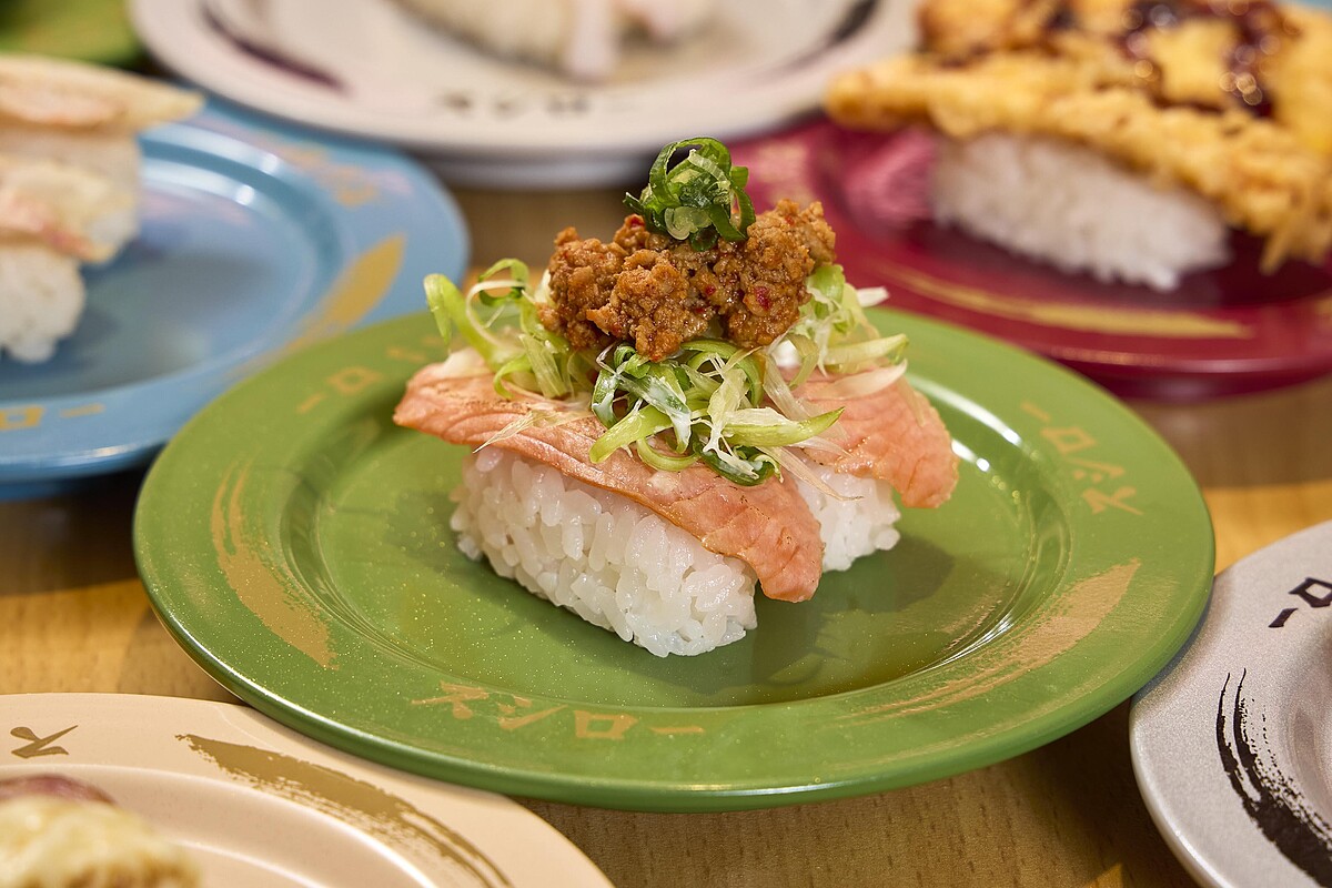 壽司郎隱藏人氣商品辣肉味噌茄子多了新夥伴,鮭魚表面炙燒綴以特製辣肉燥,適合重口味者品嘗。