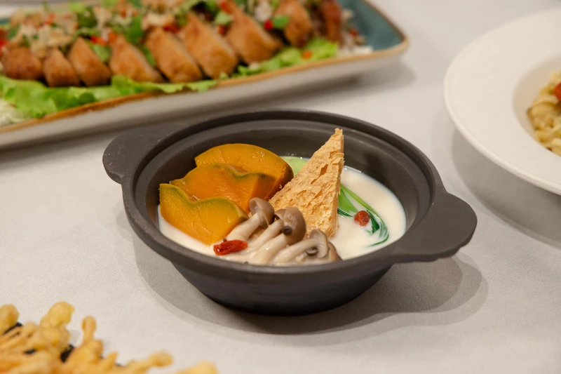 以豆乳與當令時蔬熬煮湯頭,搭配鴻喜菇、青江菜、南瓜片等豐富鮮蔬。