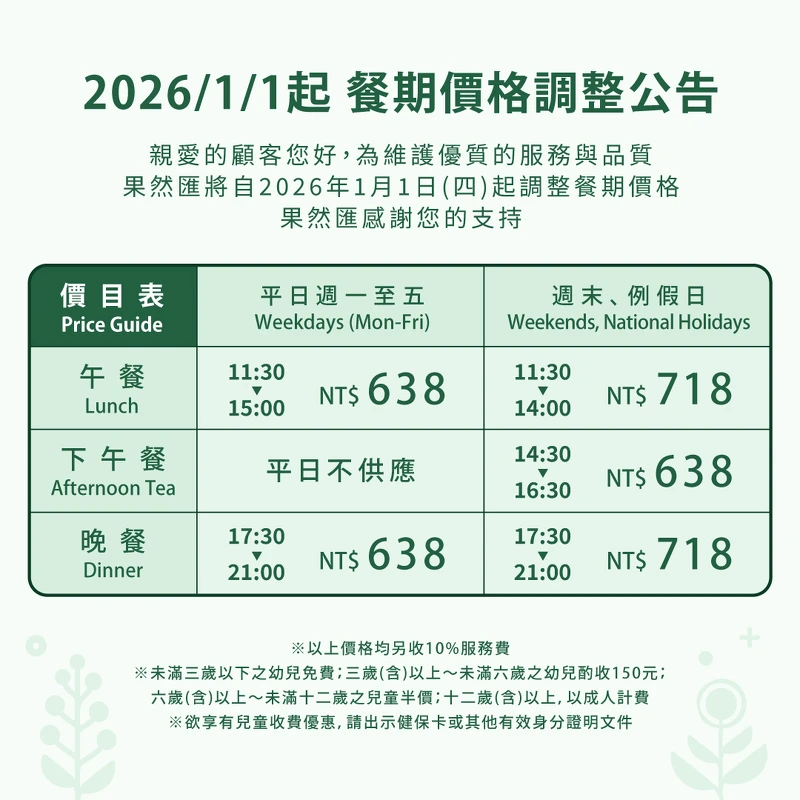 果然匯將從2026年1月1日調整餐期價格,平日午餐、晚餐從608元調整至638元,假日午餐、晚餐則從688元調整至718元,假日下午餐期為638元。