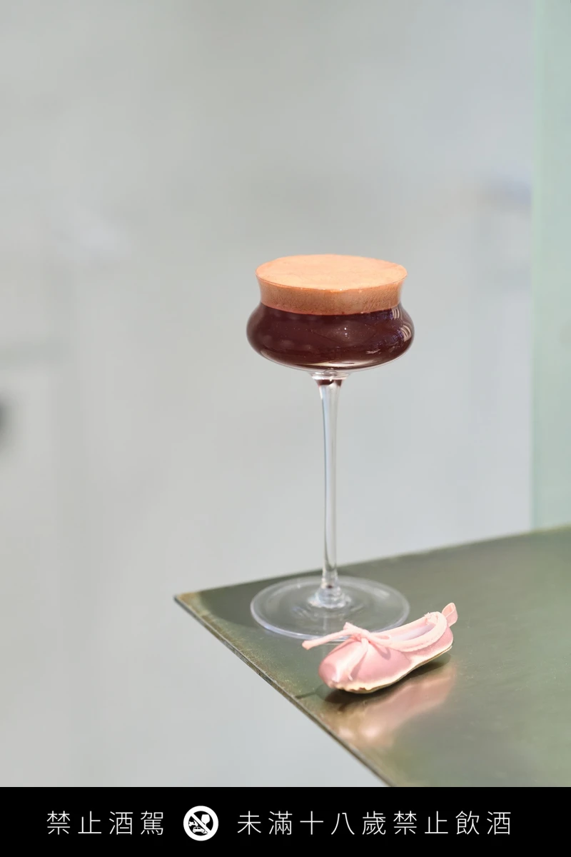 靈感取自經典草莓黛綺莉 ( Strawberry Daiquiri ),澄清後的草莓酒體如紅寶石般清澈,揉入英式玫瑰紅茶的優雅花香,最上層草莓與巴薩米克醋 粉色泡沫,將酒液裡的酸與甜昇華成柔軟細緻的緋語。