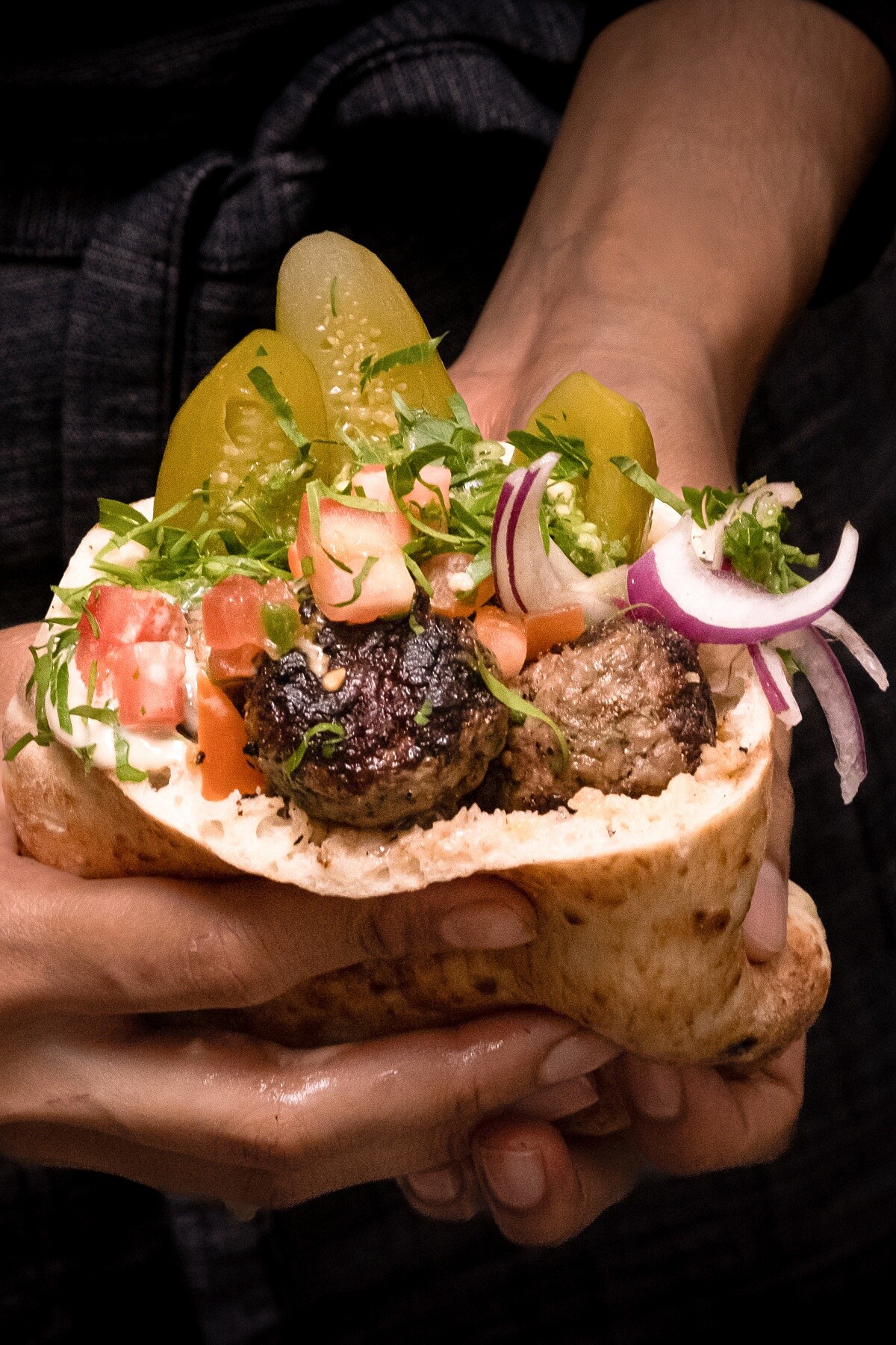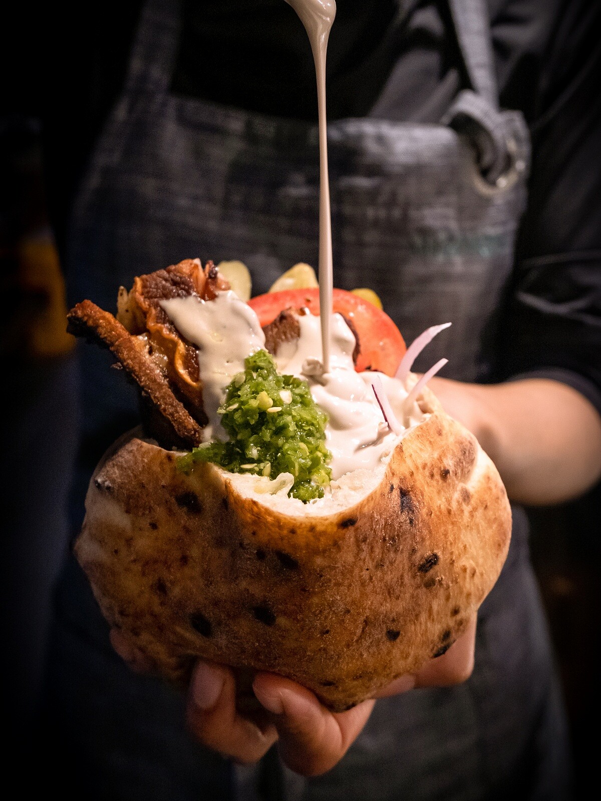 Miznon 堅持使用 100% Lumina 羊腹肉(belly),其油脂分布最均衡、肉質最柔軟,也是地中海烤肉料理最經典的香氣來源。 烤製時,羊腹肉在炭火上微微起泡,油脂滴入木炭、瞬間迸出自然煙燻味,帶出深層的香氣。以更 street-style 的方式呈現:熱皮塔包入羊肉球、醃菜、番茄與辣醬,將炭烤羊肉的原始香氣濃縮在一口之中。 主廚Yuval 說:「吃過這一口,你才會了解什麼叫 BITE。」這道菜的風味直覺、粗獷卻精準,完全展現 Miznon 最純粹的地中海靈魂。