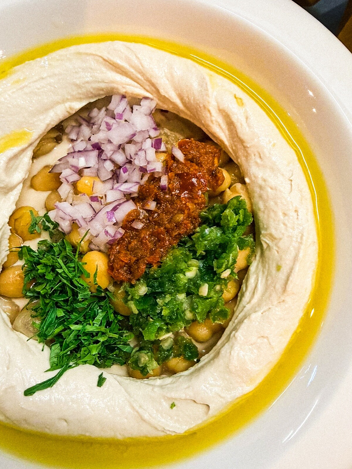 鷹嘴豆泥(Hummus)是中東飲食文化中最具代表性的經典,看似簡單,卻是一道對廚師基本功要求極高的料理。主廚說:「Hummus 必須非常 creamy,不可以有皮,也不能有熱氣蒸出的粗糙感。」Miznon 忠於傳統做法,將鷹嘴豆煮軟,加入tahina(芝麻醬)、大蒜、檸檬汁與冰水細緻攪打。而冰水是主要關鍵,可讓整體保持細滑乳化、顏色明亮。最後加入少量自製辛香醬、harissa(北非辣醬)、新鮮紅洋蔥,淋上高品質橄欖油,再添上以低溫煎至柔軟的整顆鷹嘴豆,堆疊出多層次口感。 簡單、直接、天然,是 Miznon 餐桌最不能少的靈魂起點,永遠讓人想再舀下一口。