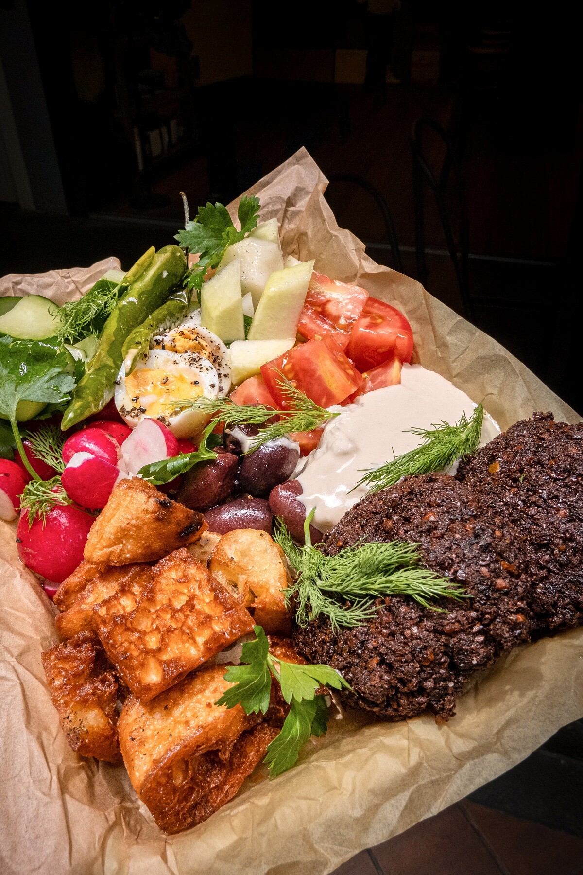 耶路撒冷 Mezze 花園拼盤 是一道色彩繽紛、層次豐富的中東經典料理,融合新鮮、醃製與烹飪食材,展現地中海飲食文化的奔放與多元。拼盤中以明亮爽口的黃瓜番茄沙拉開場,搭配鹹香醃橄欖與柔軟細緻的雞蛋,並以濃郁滑順的塔希尼醬增添堅果香氣。而外酥內軟的鷹嘴豆球(Falafel)則作為靈魂主角,帶來香料與口感交織的驚喜。整道料理以清爽、濃郁與酥脆三種風味軸線交錯,兼具視覺美感與營養平衡,是早午餐、午餐或分享開胃菜的理想選擇,也最能體現中東料理自由、直覺、熱情的魅力。