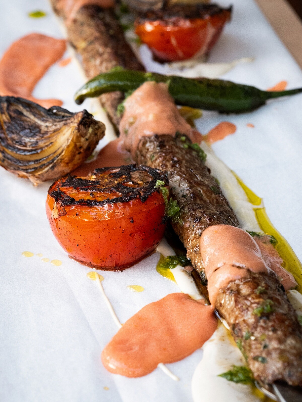 Miznon 堅持使用 100% Lumina 羊腹肉(belly),其油脂分布最均衡、肉質最柔軟,也是地中海烤肉料理最經典的香氣來源。 烤製時,羊腹肉在炭火上微微起泡,油脂滴入木炭、瞬間迸出自然煙燻味,帶出深層的香氣。 晚間版 Fatty Lamb kabab 串烤羊肉上桌時仍帶著溫暖炭香,配上芝麻醬、番茄泡沫與自製辣醬,風味立體、辛香明亮。羊肉的油脂被炭火「喚醒」,肉汁滑順而乾淨,是 Miznon 夜間料理中最具力量的一道。