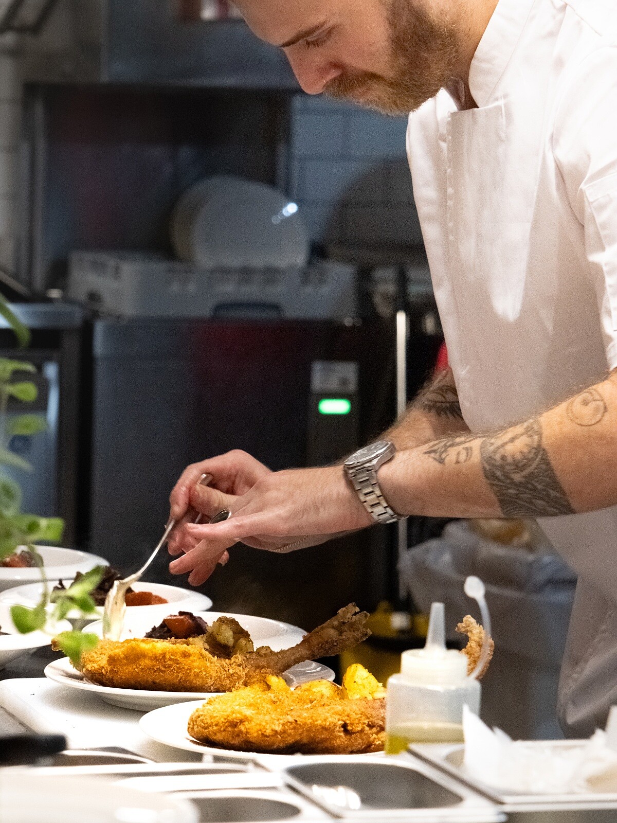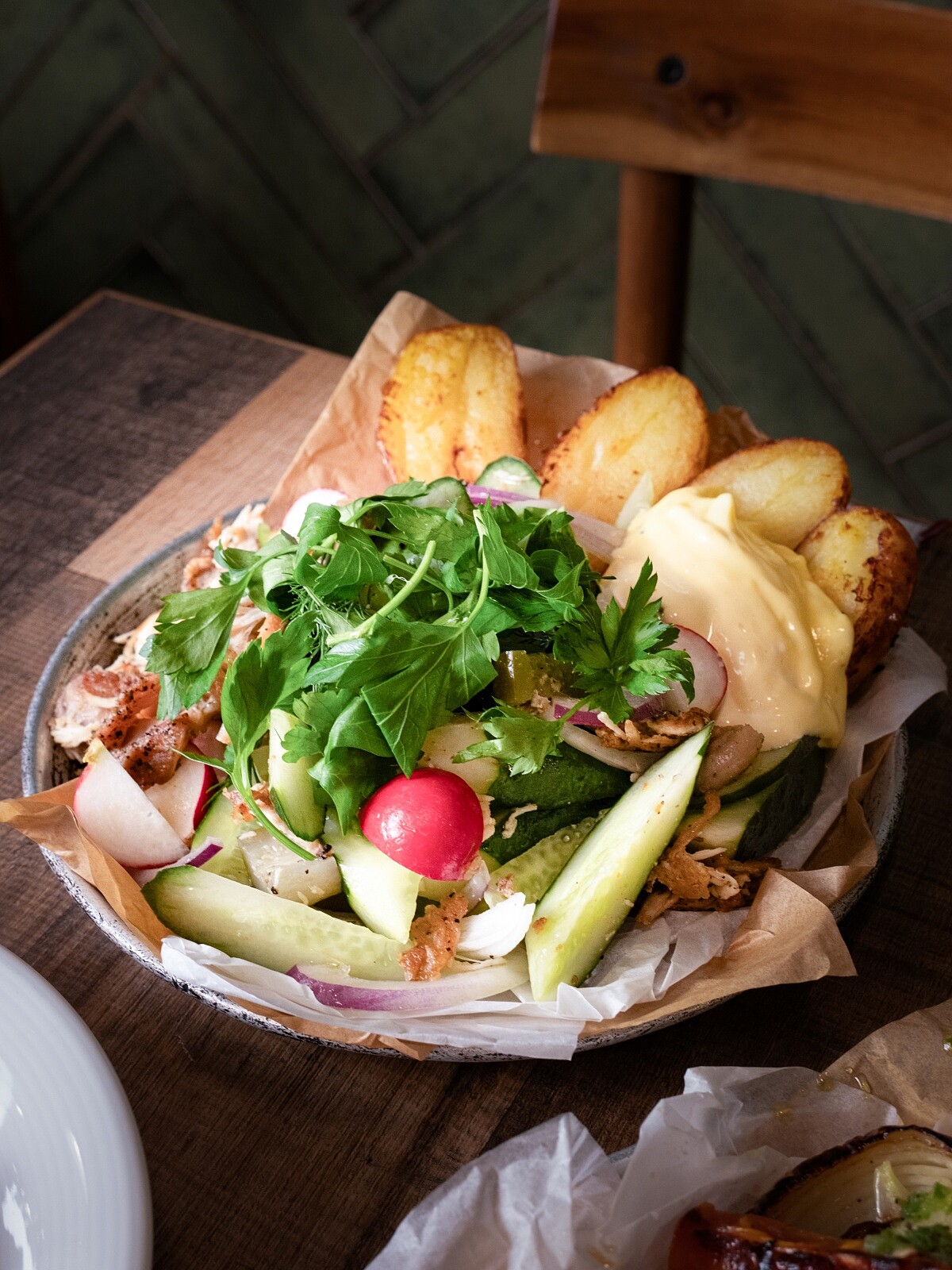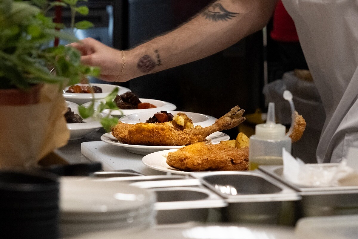 室內則以開放式廚房為中心,料理在空間中被完整地看見,火焰的溫度、廚師的動作與聲音,構成用餐過程的一部分。特別的是還以當日使用的蔬果作為裝飾,佈置在窗台、吧台抑或是餐桌上。室內牆面則保留下手工塗抹的痕跡,燈具與管線沒有刻意隱藏,桌椅與吧台以木質與金屬為主,使用感清楚,也不追求整齊。深綠色人字形瓷磚沿著牆面鋪展,成為空間裡最穩定的背景,讓視線自然回到桌上。