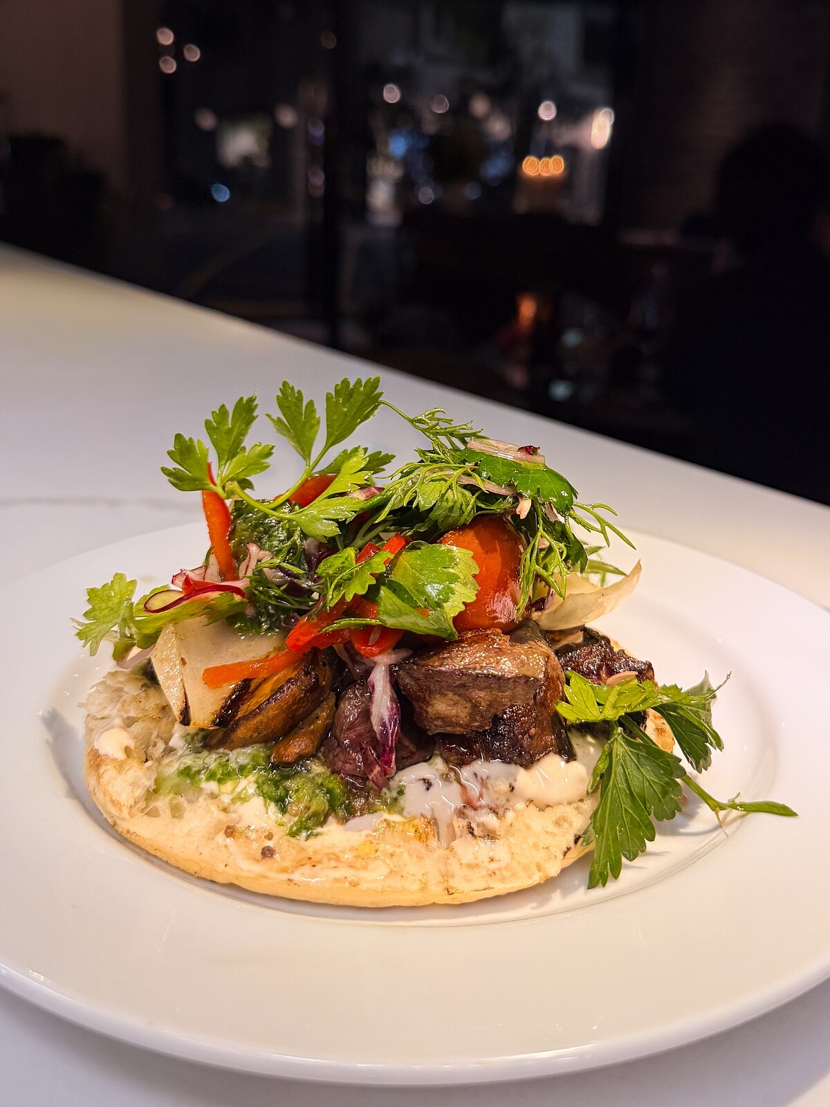 因為開放式廚房的設定,因此能親眼看見這裡完全沒有複雜的低溫烹調或過度塑形的盤飾。Chef Yuval 表示,料理的本質是「處理」與「提升」。他幾乎每日造訪臺灣在地市場,透過觸摸、嗅聞來理解季節的變化。對他而言,高品質並不等同於昂貴的松露或魚子醬,而是剛摘下、飽滿的番茄,又或者是帶有陽光氣息的一束束香草。對食材的尊重,也具體呈現在其招牌的「BITE」(一口)哲學中。咬下的溫熱、軟Q且充滿麵香的皮塔餅時,感受到的是食材間的化學反應。慢燉牛胸肉油脂化開的甜味,或者是鷹嘴豆泥如同奶油般絲滑的質地,這股味道的爆發力不需要繁瑣的解釋,只要吃一口,就能理解品牌所強調的「生命力」。