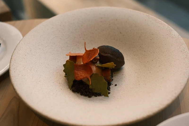 像「碳烤栗子/紅烏龍/煙燻龍眼乾」,吃起來很像深秋留下的氣味,火與時間慢慢堆疊出的溫度。前菜「蕈菇、黑蒜、帕馬森」中,柳松菇、黑美人、香菇、杏鮑菇先煎再炭烤,搭配以黑蒜、馬鈴薯與發酵奶油製成的黑蒜醬,味道厚實,帶著接近土壤的深層氣息。海鮮料理則從生活記憶出發,利用海菜、鹽麴野薑花與湯底,勾勒出台灣海洋的鹹鮮景致。小編很喜歡這一段設計,因為它不是在複製某種料理風格,而是在整理我們熟悉卻說不清的味覺記憶,更是用味蕾帶著我們一同走在台灣的鄉村田野,或是回憶起兒時的記憶。