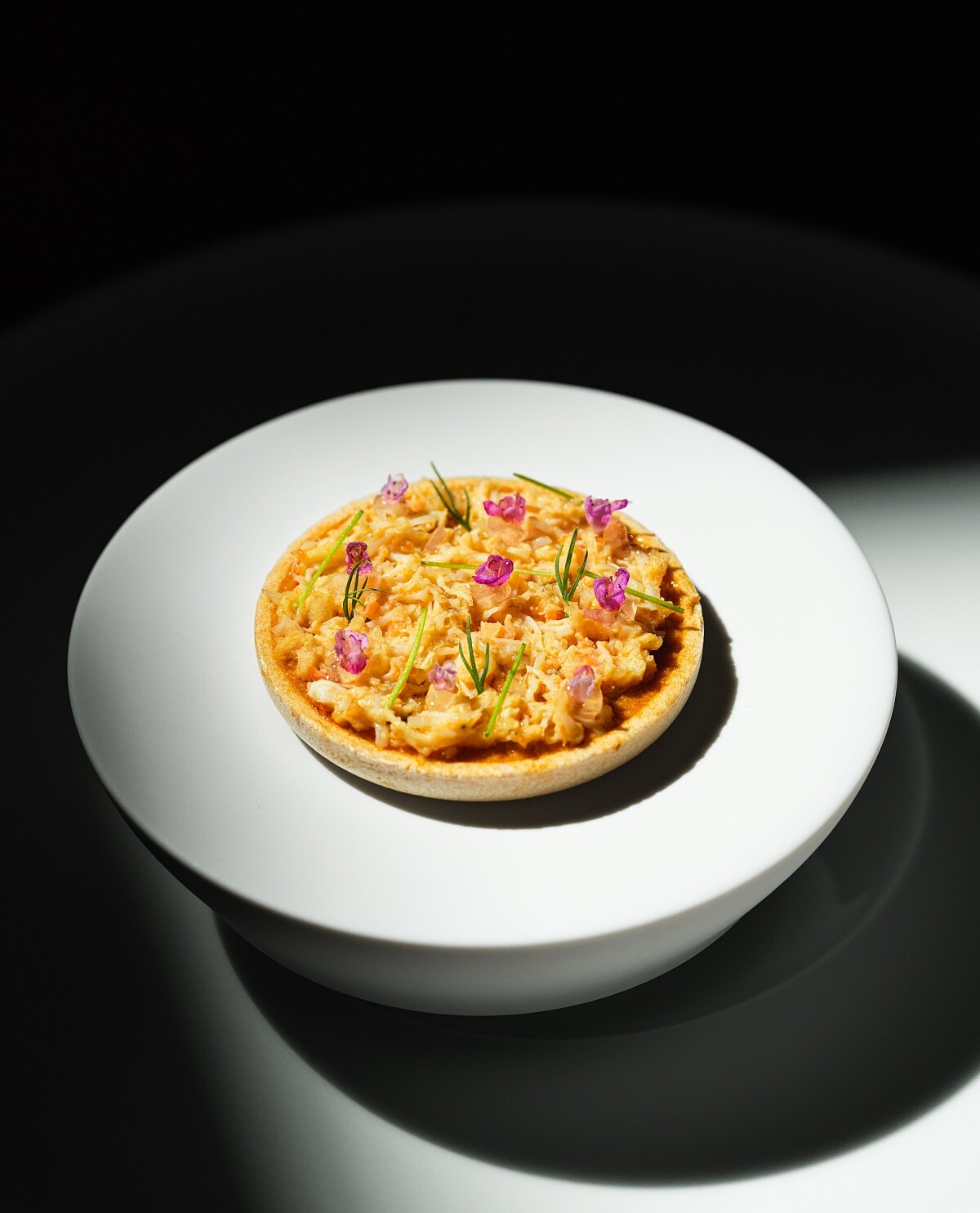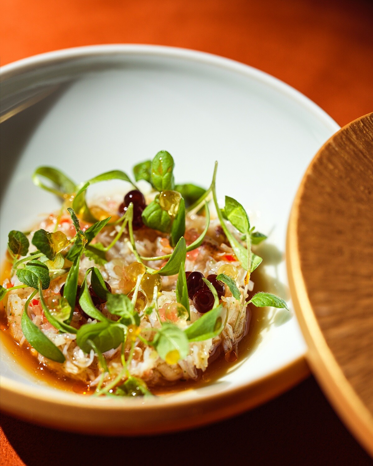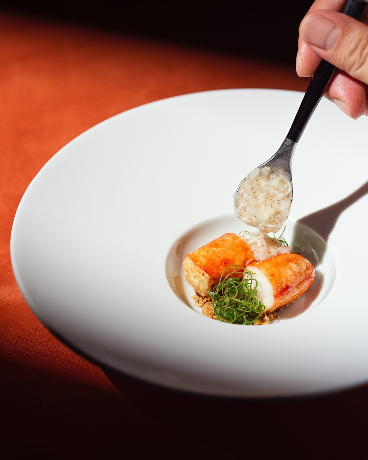這道料理取材自廣東潮汕的「撈魚生」文化,主廚刻意不走新加坡、馬來西亞年節常見、鋪滿長蔬菜的版本,而是回到更貼近日常的吃法,保留「撈」所代表的共享與祝福意涵,再以當令秋蟹重新演繹。以生魚片替換為膏黃豐腴的麵包蟹,底部使用辛香料為基礎,結合魚露與香吉士調成酸、辣、香並進的醬汁,上方鋪上拌好的蟹肉,再點綴巴薩米克醋、芥末橄欖油與手指檸檬等風味晶球。上桌後把所有元素充分拌勻,讓蟹肉完整吸附醬汁,入口鮮活明亮,既保有潮汕撈魚生的精神,也展現餐廳對秋蟹的當代表達。
