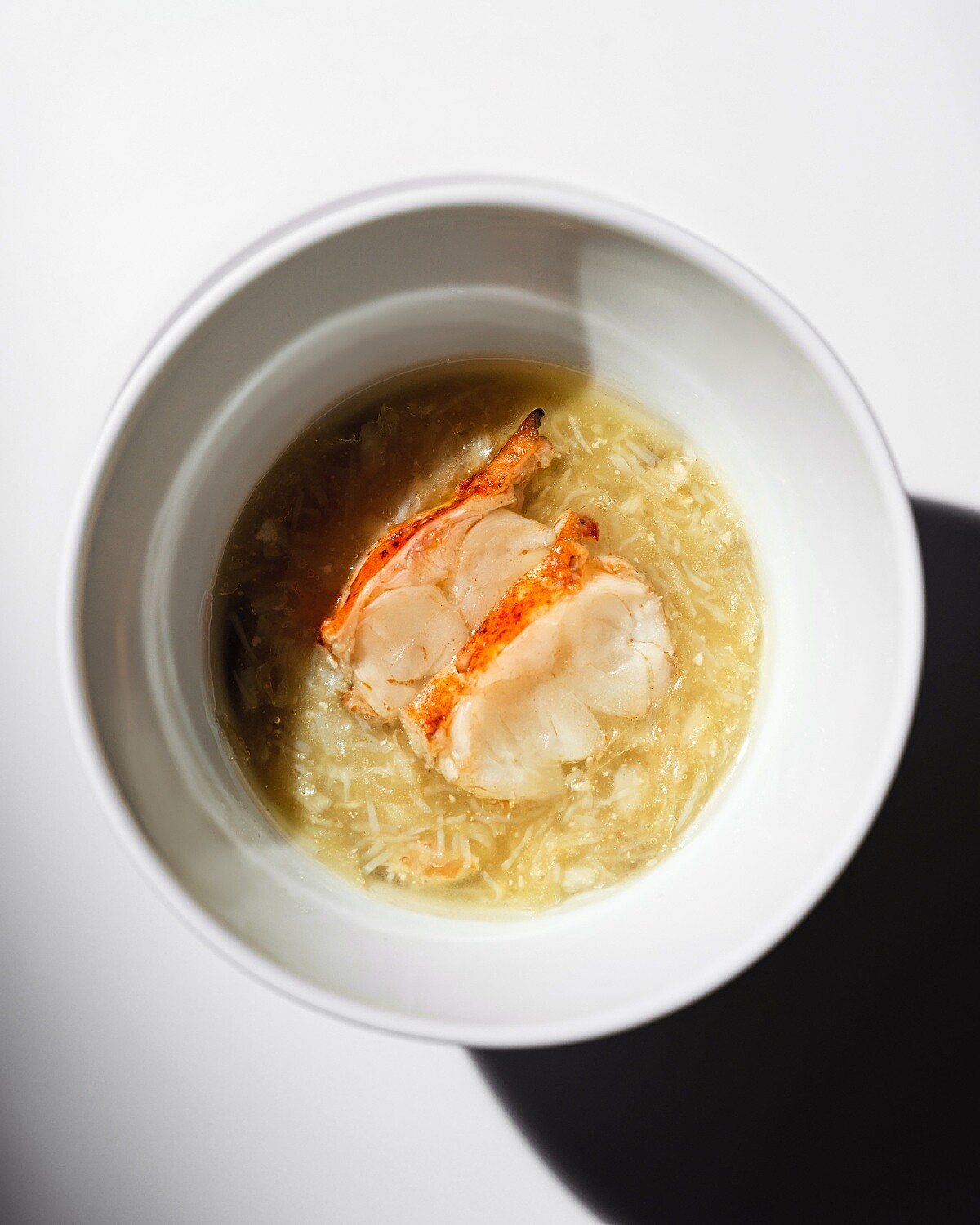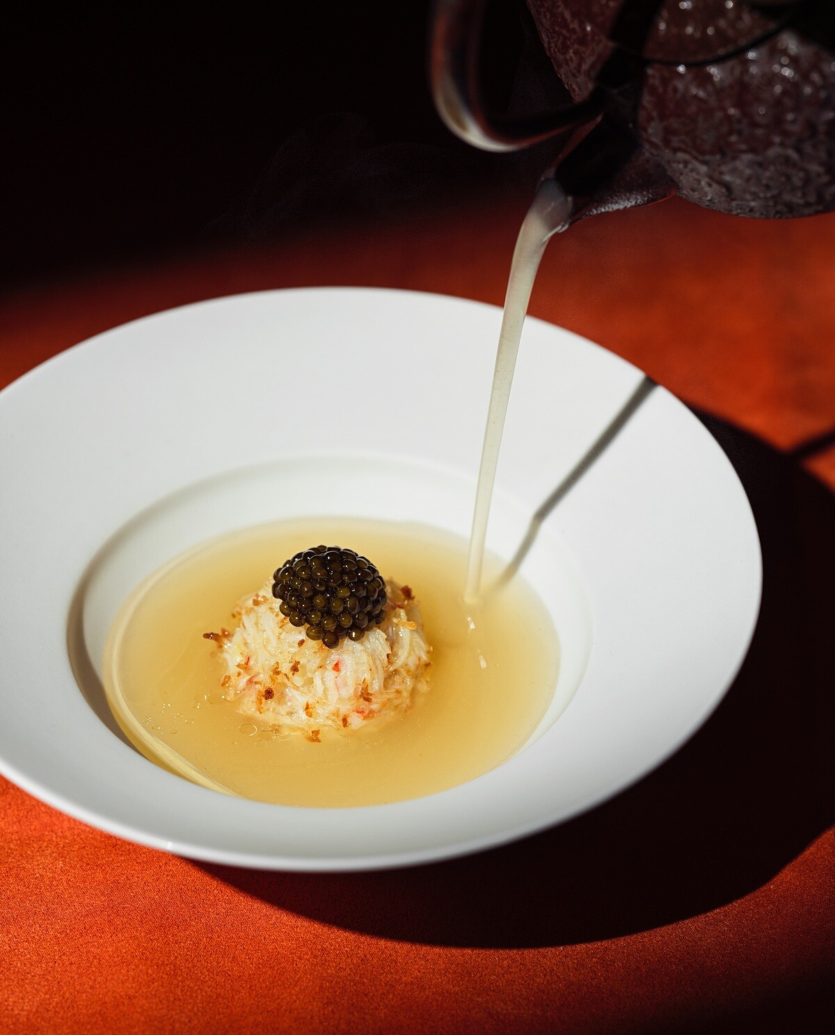 以粵式「蟹珧燕窩羹」與「燕窩蟹子湯」為基礎,Chef Leo 將廣式湯羹講究的細火工序,結合日式椀物的精緻技法,轉化為一款風味乾淨、層次細膩的蟹品湯物。主體以松葉蟹蟹肉混合日本山藥與蛋白,低溫油炸製成質地蓬鬆柔潤的蟹肉真丈,帶出日式料理特有的輕盈口感。底部鋪上以雞湯與金華火腿細熬而成的上湯凍,冰涼中藏著溫潤鮮香,其上覆以白燕窩,輕淋雞油增添滑順度。上桌時再沖入熱騰騰的清雞湯,讓湯凍緩緩融化,形成溫熱與涼潤交錯的口感變化,最後點綴少量魚子醬,帶出鹹鮮回甘的收尾。整體呈現既保留廣式湯品的深度,也展現日式椀物的節制與細膩。