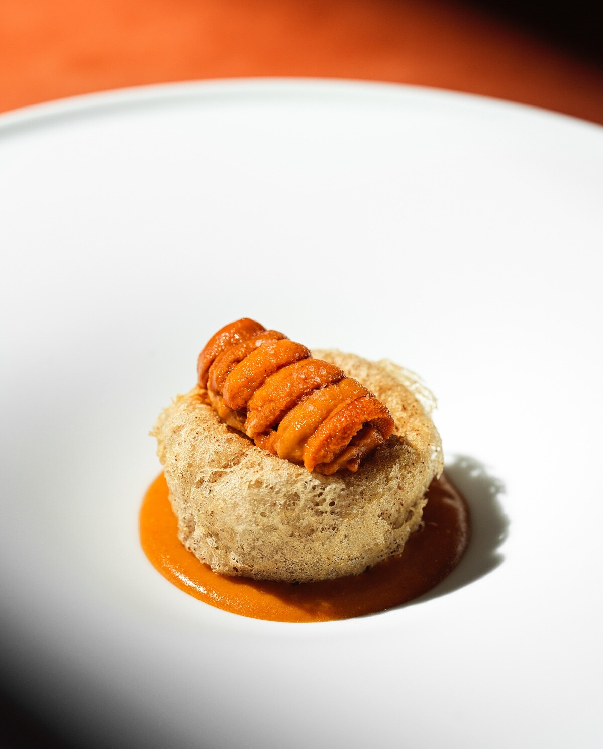 取自粵菜經典「荔蓉釀蟹粉」,其中包含粵菜裡「荔蓉」的處理方式,刻意讓內餡若隱若現,介於流心與半熟之間。主要食材為香箱蟹、大沙公與沙母,融合赤上海膽,讓蟹的鮮甜與海膽的濃郁在口中交疊。香箱蟹有細緻蟹黃與蟹籽的甘香,大沙公則肉質厚實、鮮味集中,沙母蟹膏則補足油脂與香氣,共同構成蟹粉的核心輪廓。外層以大甲芋頭拌入豬油與蟹籽後酥炸至微裂,內餡則以蟹粉為主,將蟹肉、蟹膏與蟹黃炒香,搭配馬蹄與西芹,讓油潤之中保有清脆層次。底部再佐以海膽與白蝦熬製的蝦醬,微辣收尾,最後在芋蓉球點綴上海膽,讓鮮味與甘香延續。整體風味更顯乾淨、層次分明,在濃與淡之間取得恰好的平衡感。