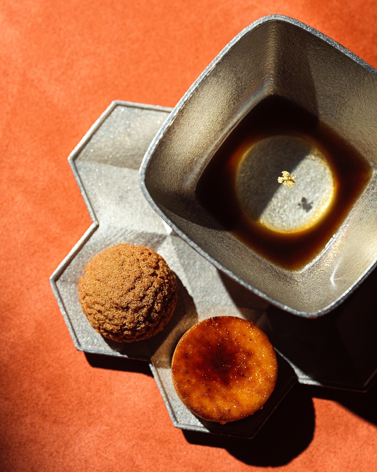 甜點以「薑」與「黑糖」作為共同風味主軸,呼應東方飲食中「蟹性偏冷、以薑調和」的傳統理解,讓整套蟹宴在尾聲回到平衡的想法。位在上方的是「鳳梨酥」,內餡選用金鑽鳳梨,並加入以黑糖製成的薑糖,下方搭配處理過的焦糖,酸甜之中帶有溫潤辛香。第二道是碗中的「水信玄餅」,轉化為嫩薑風味,搭配以冬瓜與黑糖熬製的糖漿,口感柔軟、甜度收斂。最後一道是下方的菠蘿泡芙,內餡以栗子南瓜與老薑製成,外層灑上黑糖粉,香氣厚實。整組甜點建議依序享用鳳梨酥、水性玄餅,最後以菠蘿泡芙作結,並可搭配咖啡或茶,為整場餐敘畫下溫和的句點。