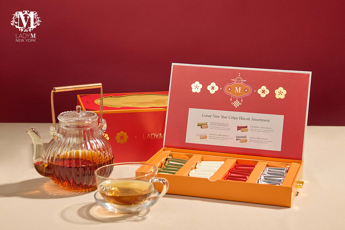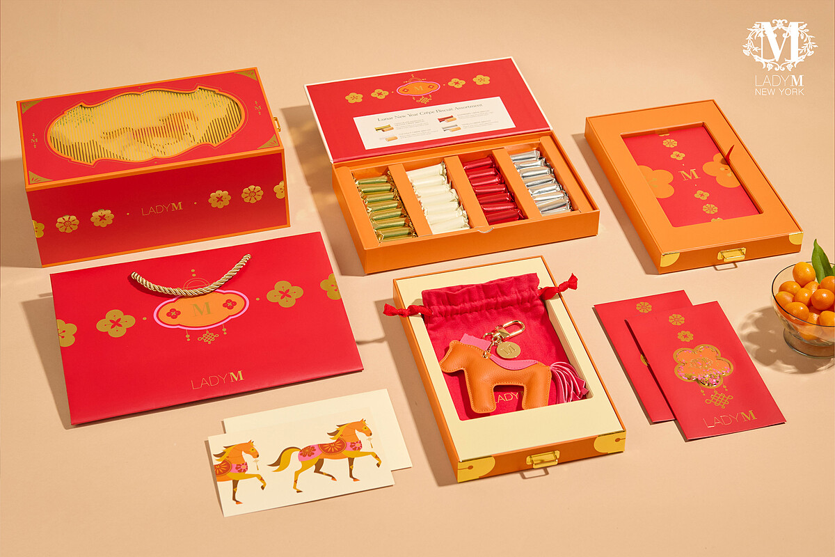 這款禮盒以奔馬為主視覺,搭配閃動波紋動畫,抽屜開合之間,馬影如生,象徵新年奔騰的氣勢與好運,內含的「可麗捲餅」以Lady M千層蛋糕的可麗餅皮(Crêpes)為發想製作,共有香草、香橙榛果可可、椰子與覆盆子四款風味。