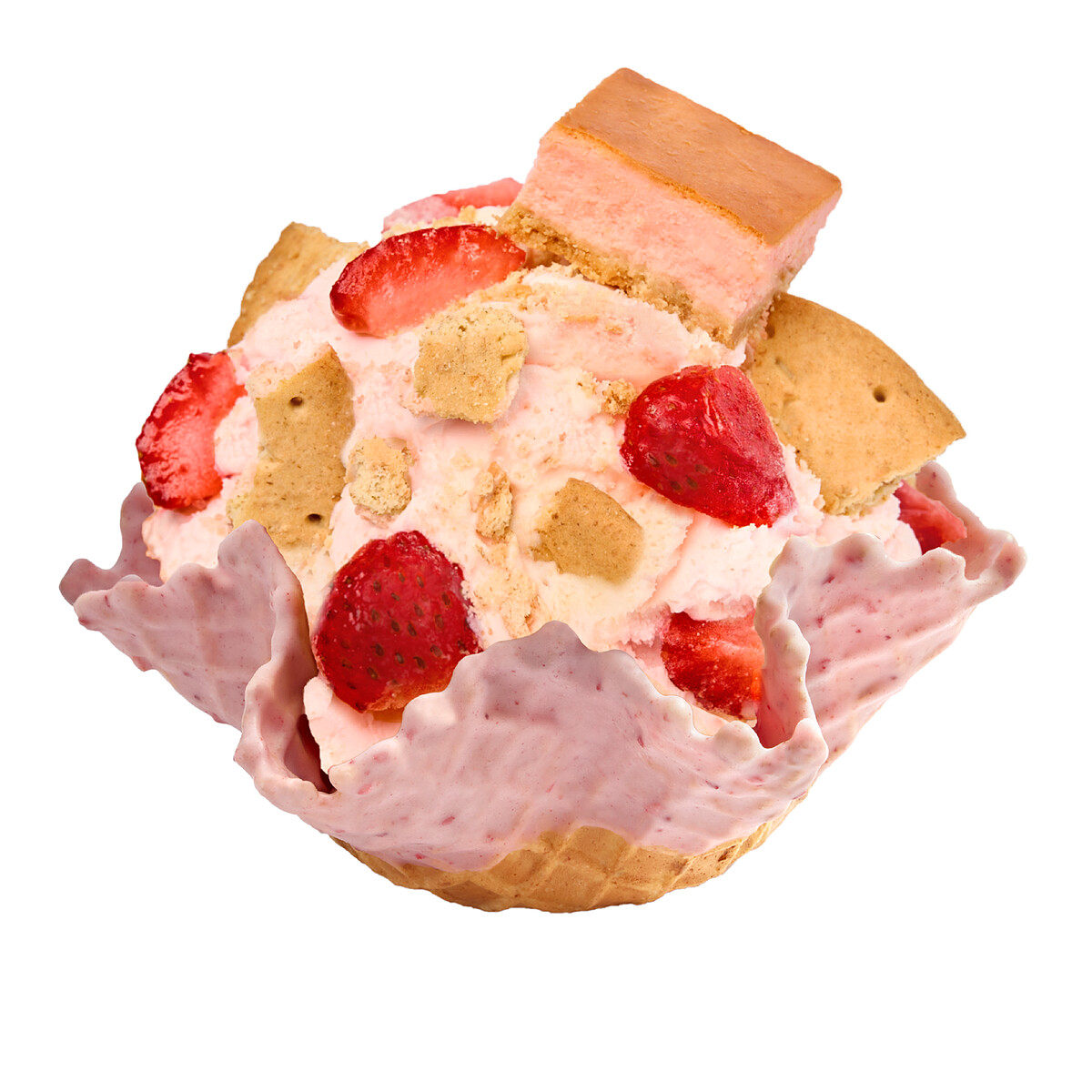 酷聖石瞄準近年來在甜點界爆紅的「巴斯克乳酪蛋糕」,研發團隊將濃郁的乳酪風味融入冰淇淋基底,以草莓的酸甜果香來平衡乳酪的厚重感。最令人驚喜的是,冰淇淋上方豪邁地放上一整塊「草莓巴斯克蛋糕」,每一口都能吃到綿密乳酪與酸甜莓果交織的幸福滋味。