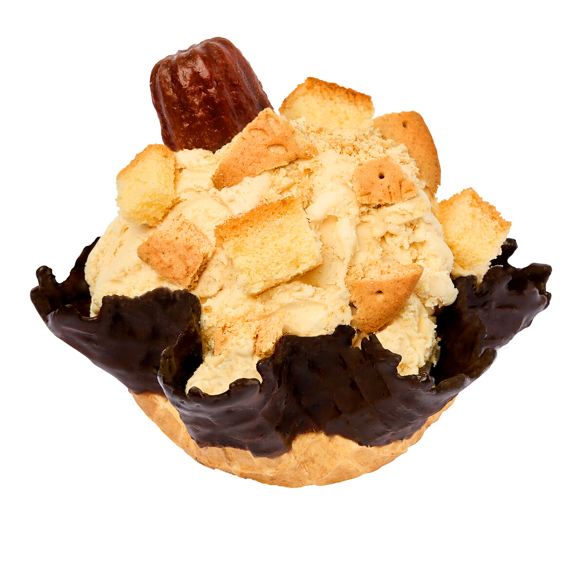 而「可麗露戀曲」則鎖定喜愛大人系口味的饕客。以法式經典甜點「可麗露」標誌性的苦甜焦香為主調,搭配酥脆餅乾、鬆軟蛋糕增加口感層次,在視覺上更是吸睛,冰淇淋頂部點綴了一顆迷你可麗露,堪稱是「可以吃的法式甜點」。