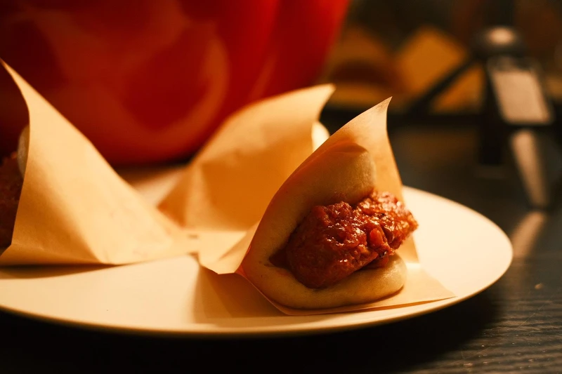 巴斯克香腸Txorizo選用六堆黑豬多個部位製作,風乾後經過直火炙烤,香氣與油脂被完全逼出。搭配的刈包則夾入北投特有的青磺水煮蛋,濃稠蛋黃就像天然抹醬一樣包裹住肉塊。這道菜吃起來隨性有趣,卻能感受到主廚如何巧妙地將西班牙技法與台灣在地味覺結合在一起,這也是小編最愛的一道菜~