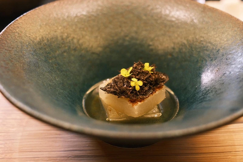 前田哲郎的料理靈魂始終是「火」,他不靠花俏的炫技吸引目光(雖然小編還是看得很開心),而是精準運用炙烤、煙燻與溫度控制逼出食材最純粹的深度風味。整套餐點節奏沉穩,炭火香氣細膩且恰到好處,與北投山林那種安靜、低調的氛圍配合得天衣無縫。