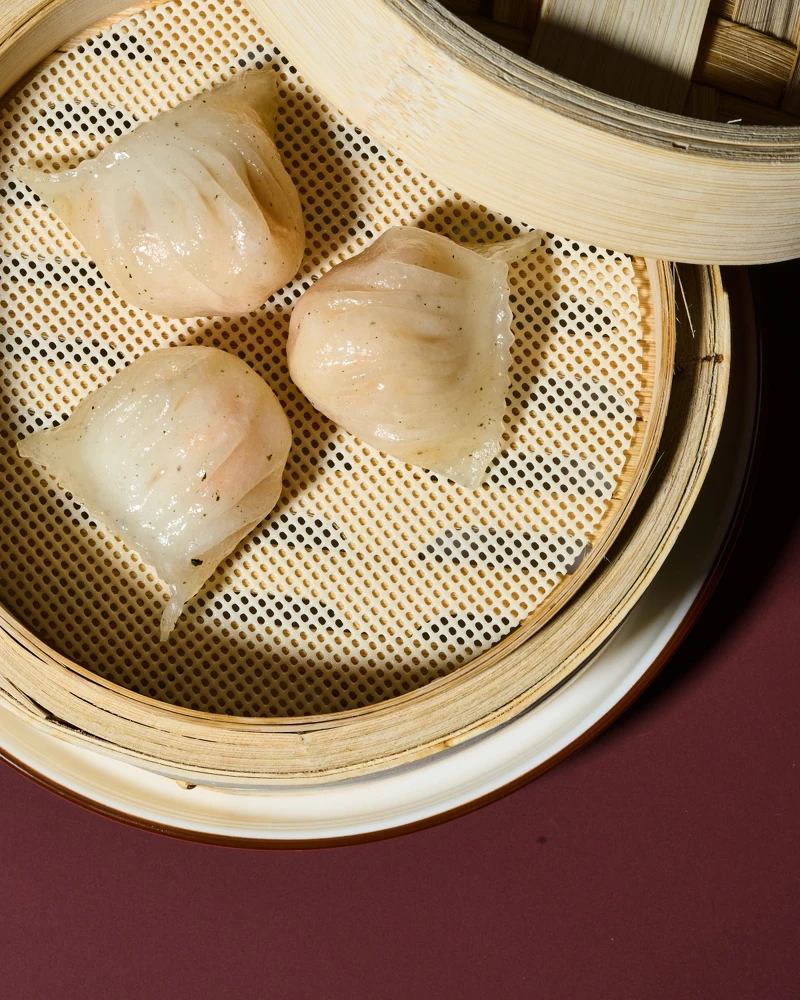 蝦餃相當考驗餡料比例與蒸製火候的掌握,外皮必須夠薄,才能在不破裂的情況下包住餡心,同時保留水分與口感。蒸好後的蝦餃外觀通透,內餡清甜,入口不顯油膩,整體呈現出港點講究卻不張揚的特色。 內餡選用口感脆彈的白蝦,搭配切丁竹筍增加咀嚼層次,並以少量豬油調和,使蒸後的餡心保持濕潤。外皮以澄粉與太白粉調製,經沸水燙麵後擀製至薄而均勻,再以傳統十三摺手工包製。蒸製時間控制在短時間內完成,讓蝦的鮮味、竹筍的脆感與油脂的香氣維持平衡,口感清爽,層次清楚。