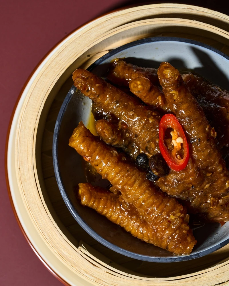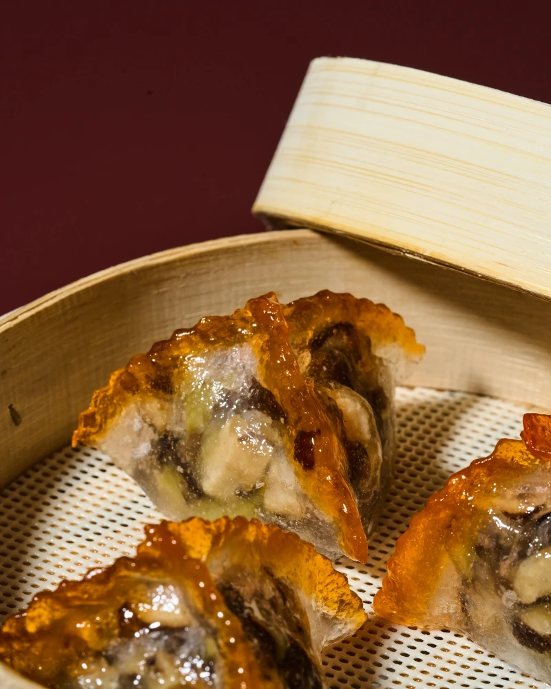港式點心中考驗工序的一道,其重點在於口感要軟以及入味。這裡選用膠質較多、肉質厚實的台灣白肉土雞爪,經過多次測試後才確定適合的品種。雞爪先刷上皮水後油炸,使表皮形成虎皮狀,再進行滷製,讓調味滲入其中,最後與蠔油、豆豉與蒜酥一同蒸熟。 完成後入口一抿就骨肉分離,入口滑潤,膠質豐富卻不顯油膩,鹹香味道集中但仍保留食材本身的風味,耐吃又經典的滋味。