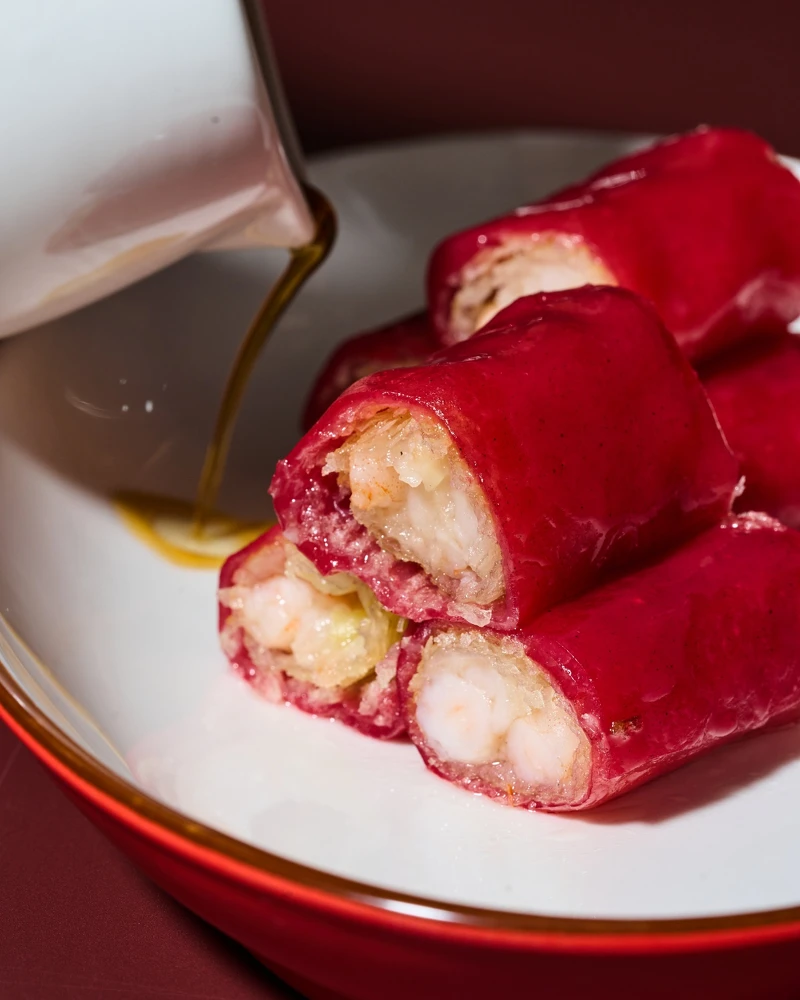 好吃的腸粉外皮必須滑順、餡料香氣鮮明,入口時還要保持輕柔口感。主廚以傳統港式腸粉為基礎重新演繹,透過製作方式上加入不同層次的處理打造了紅米脆皮腸粉。 要先將腸粉皮以粘米粉混合紅麴調製,蒸製後呈現自然淡紅色澤,米香細緻,帶有輕微的紅麴甜味。內餡包入鮮蝦、韭黃與筍丁,再以米網皮包覆後油炸,使內層形成酥脆口感,最後再裹回紅米腸粉皮。入口時外層柔滑,內裡酥香,蝦肉彈性明確,筍丁增加清脆感,在傳統腸粉結構中加入口感變化,風味層次清楚而不突兀。